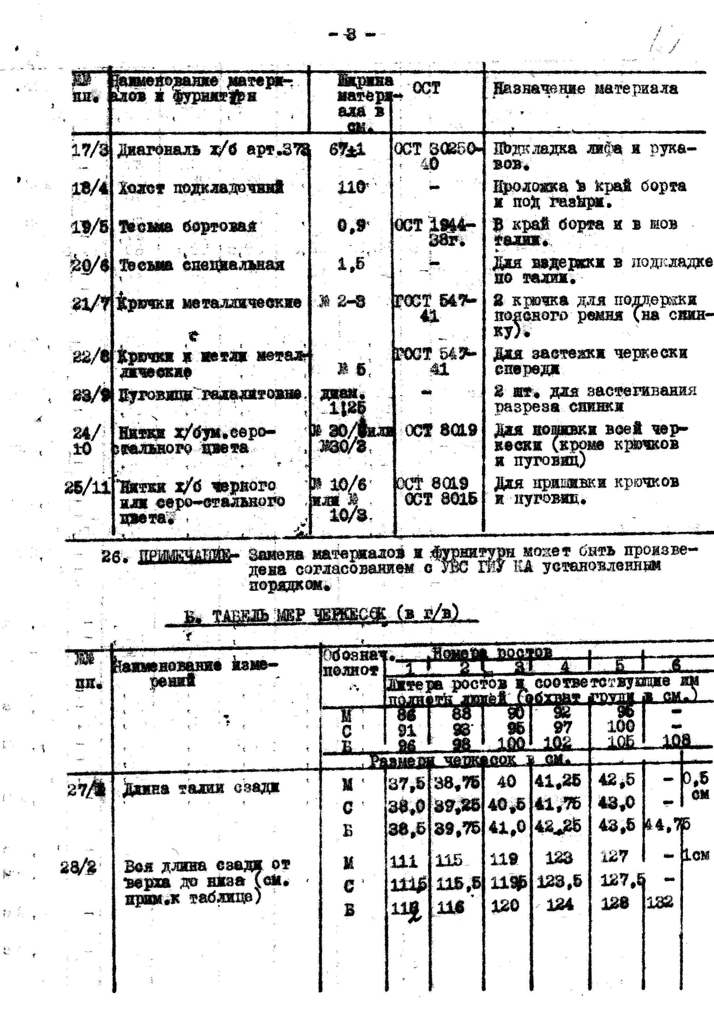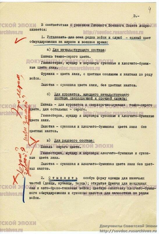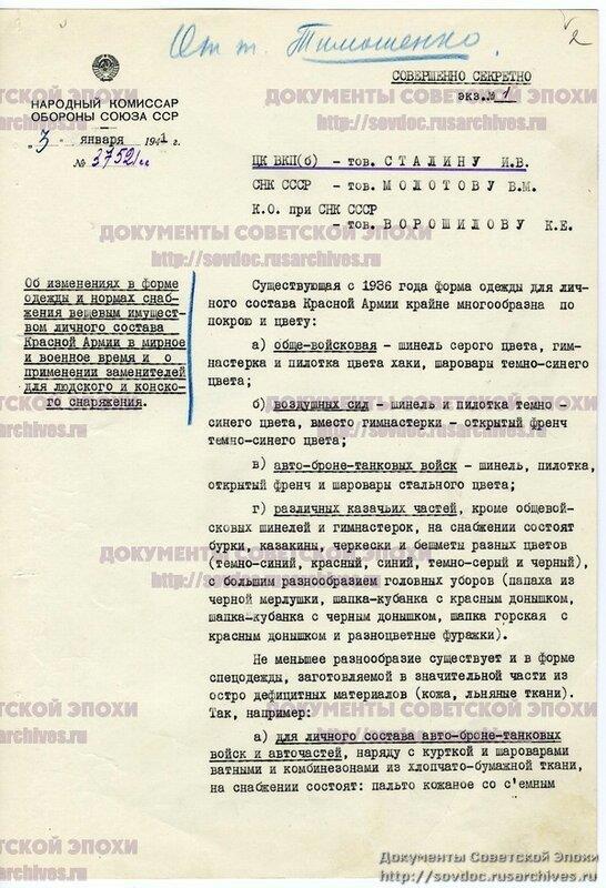д/с: фрагмент доклада И.В. Сталину Наркома обороны СССР «Об изменениях в форме одежды и нормах снабжения вещевым имуществом личного состава КА в мирное и военное время…»