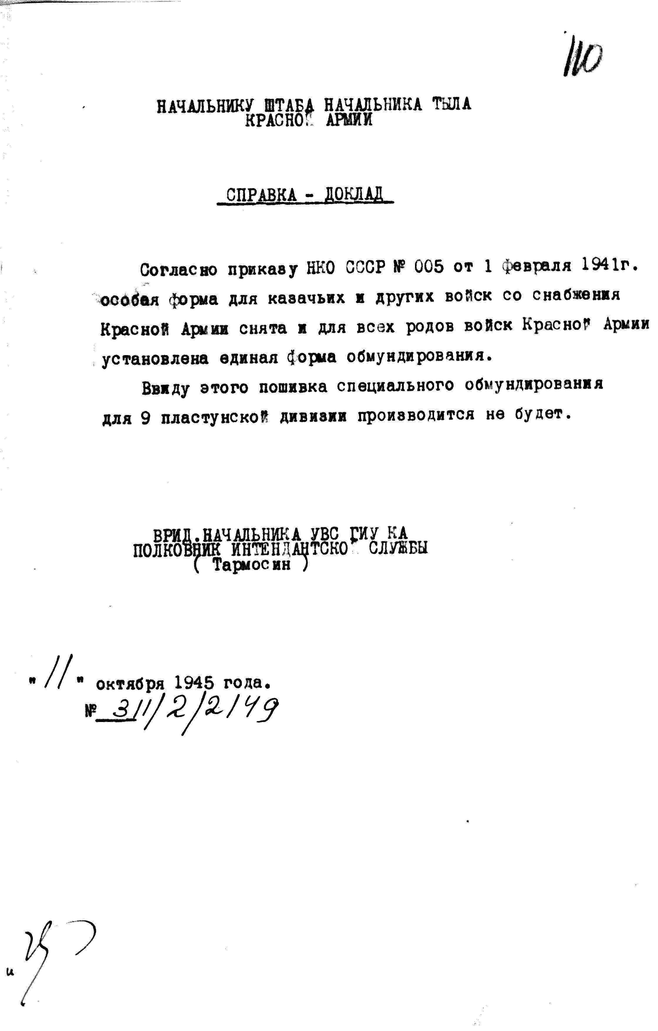 д/с: Доклад начальнику Тыла КА по запросу 9 пластунской дивизии о пошивке специального обмундирования