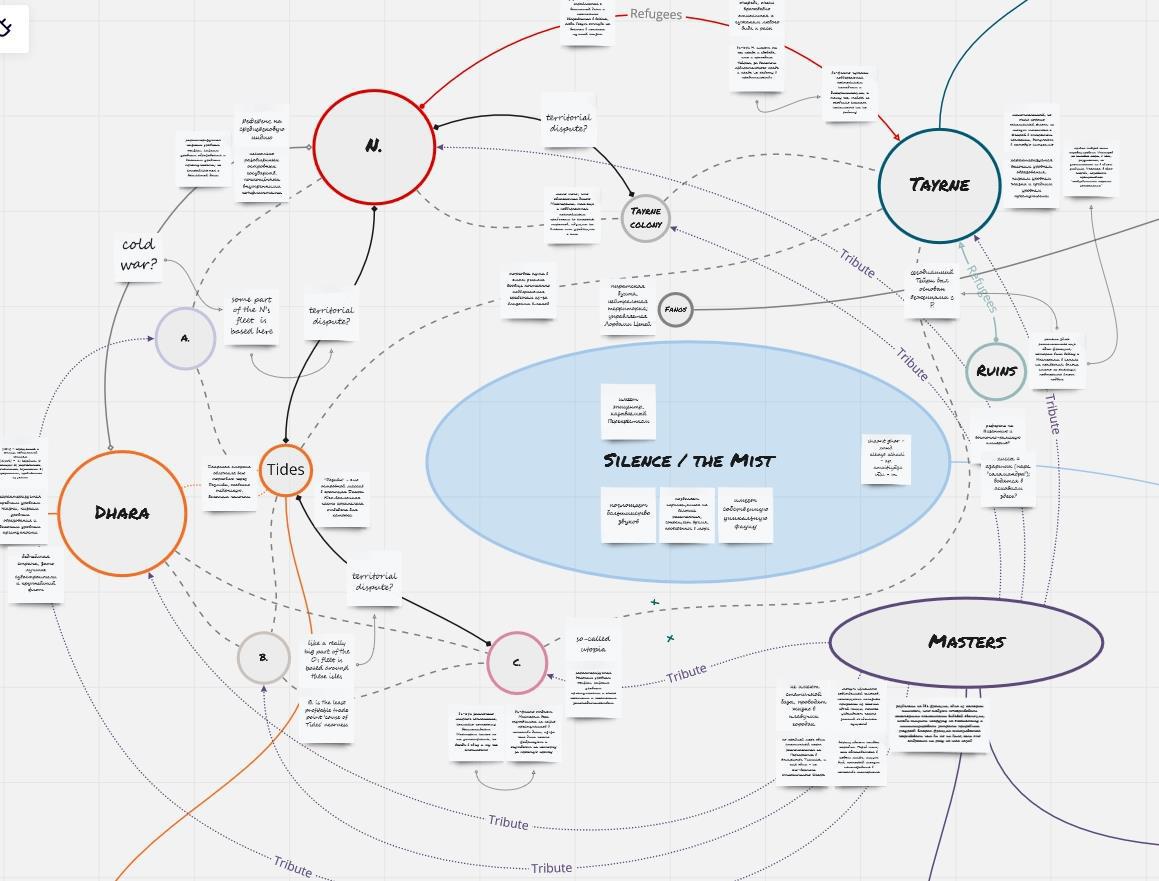 Автор: Szomorú OrsolyaТак как карта пока в разработке, поделюсь авторским закулисьем: как выглядит мир Дома в работе, а также кратким описанием мира. В данной схеме каждый кружок подразумевает под собой некое островное государство.