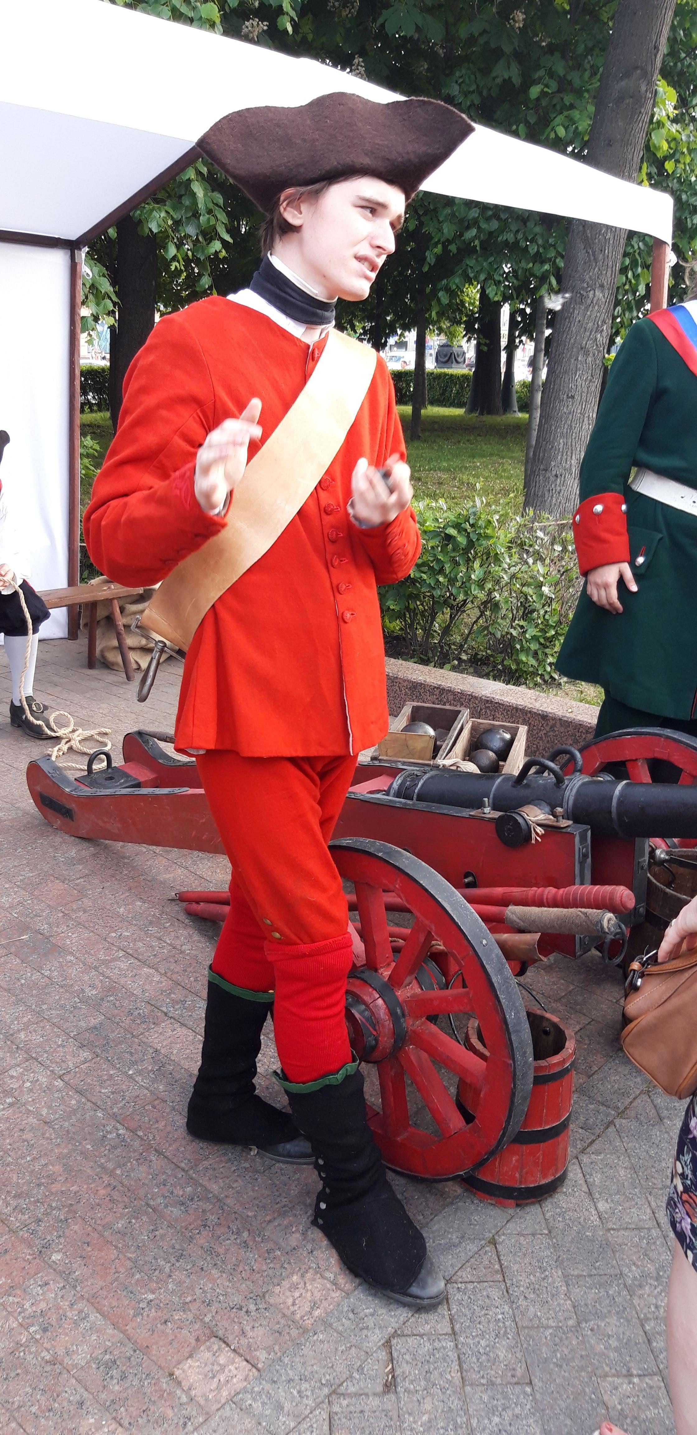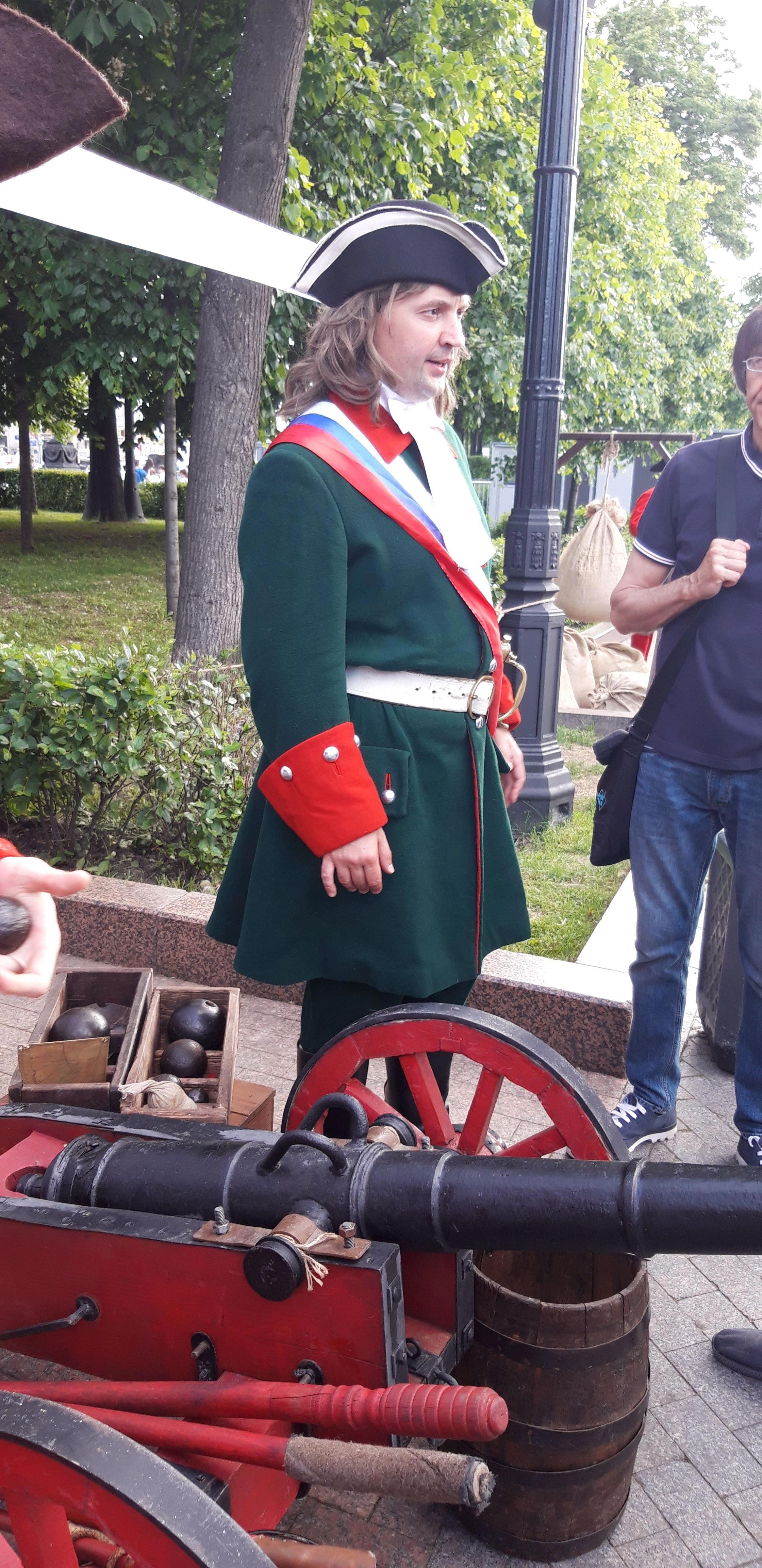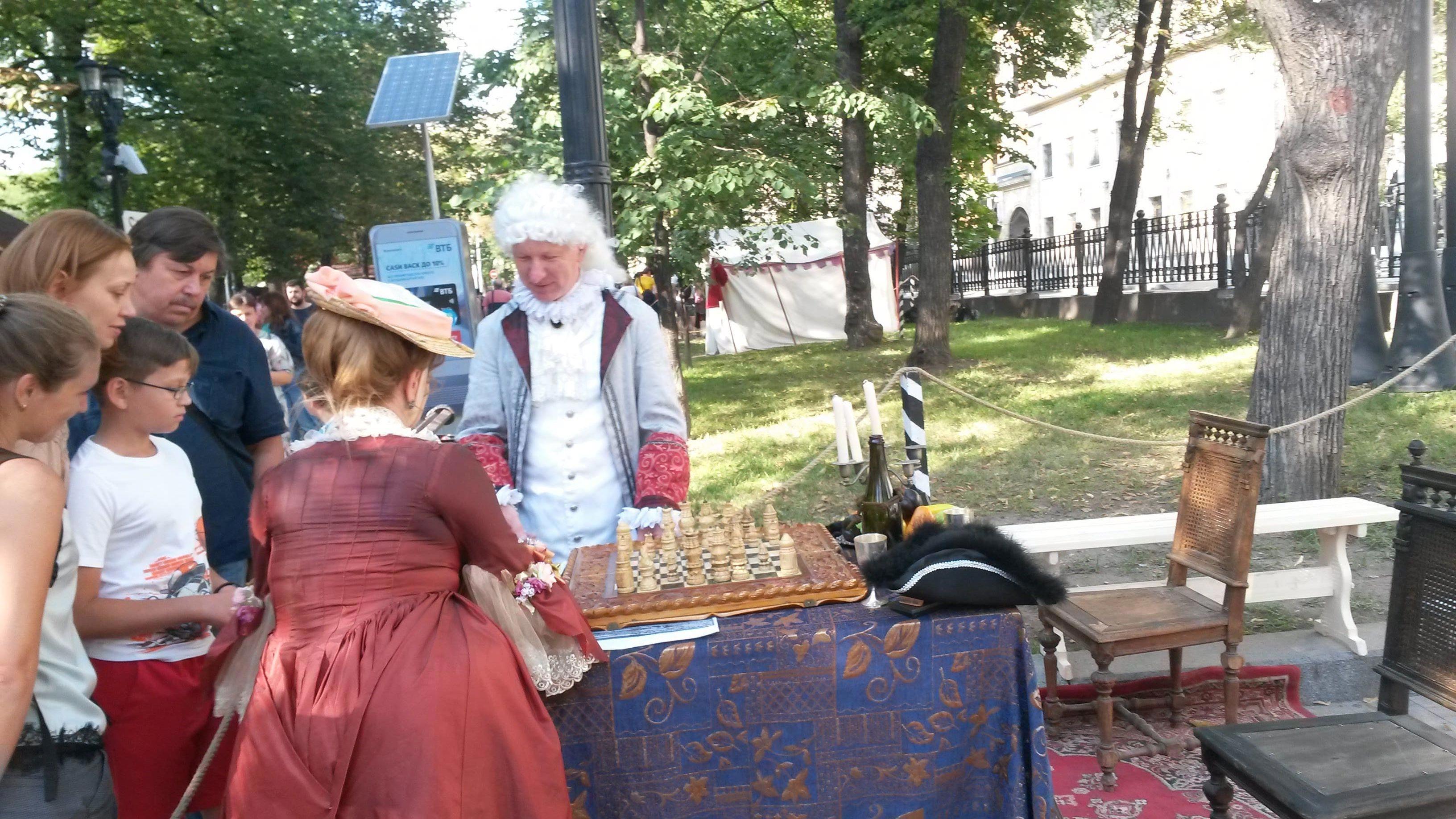 И вот мы уже во временах Петра I. За спиной памятника Пушкину, идёт постановка "Как царь Пётр арапа женил". Кажется, что бронзовый поэт даже немного морщится, не такое действо он себе представлял. А зрители - очень довольны и спектаклем, и актёрами, и возможностью в антракте сделать с актёрами фото на память:
