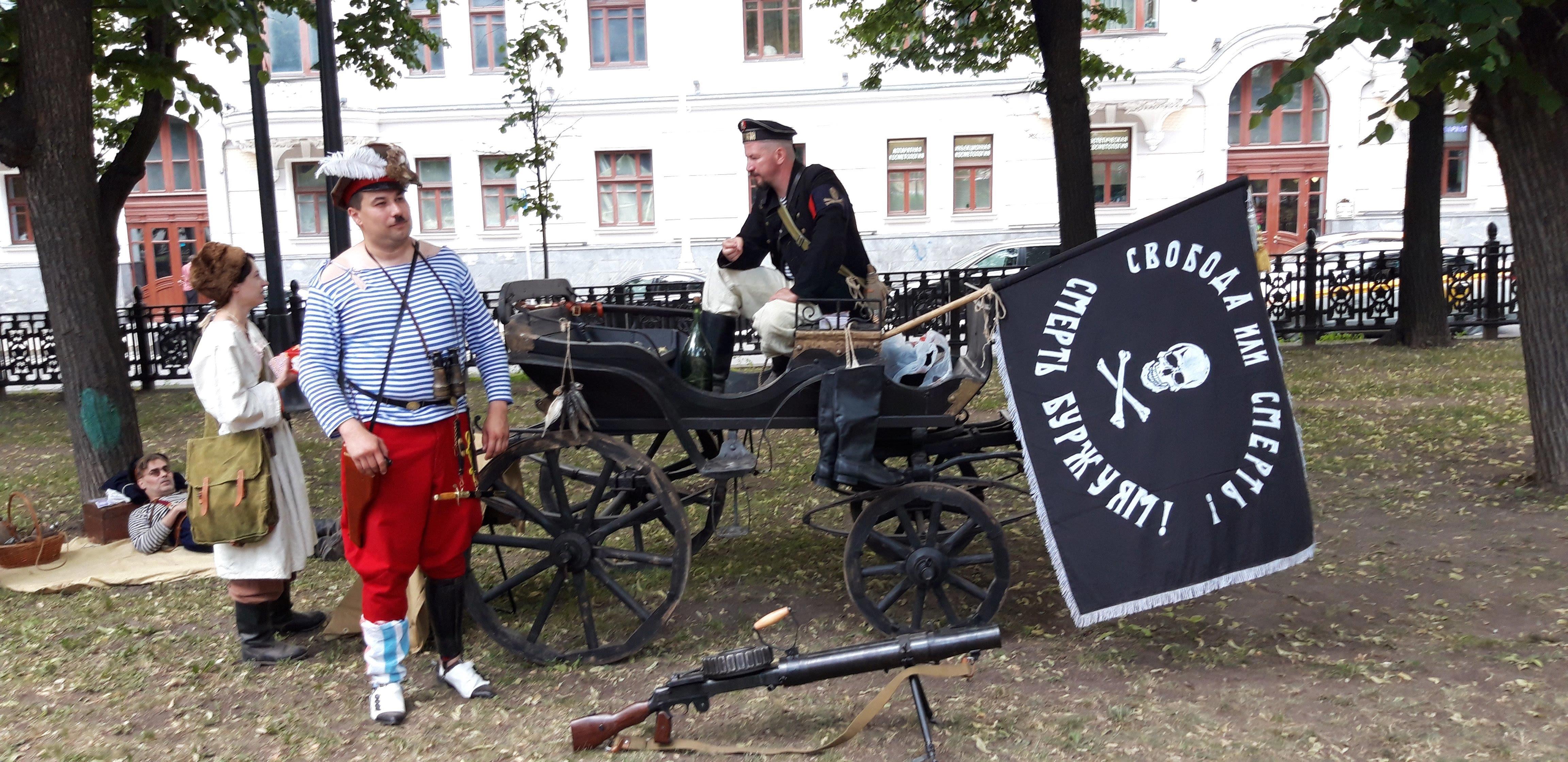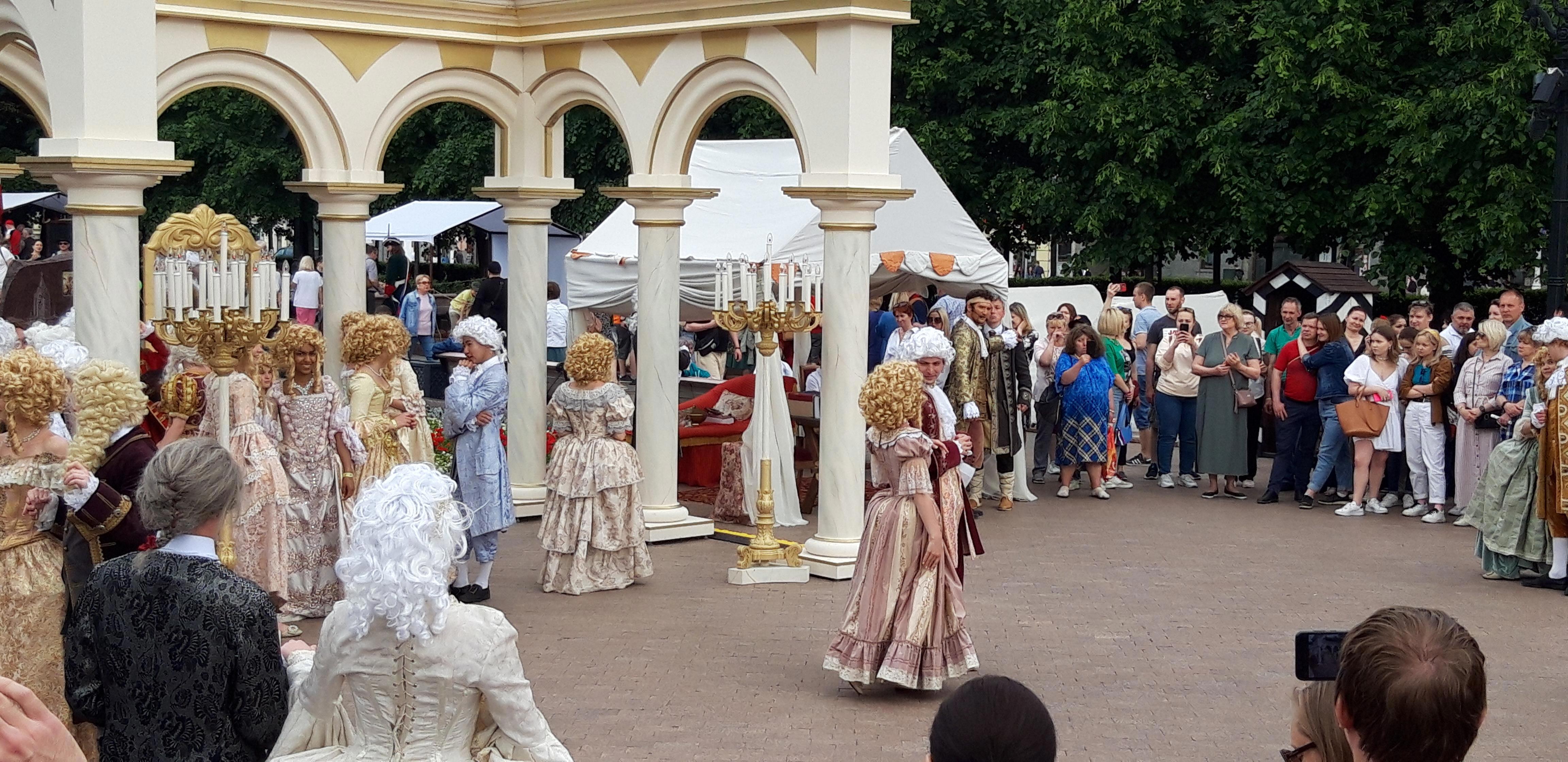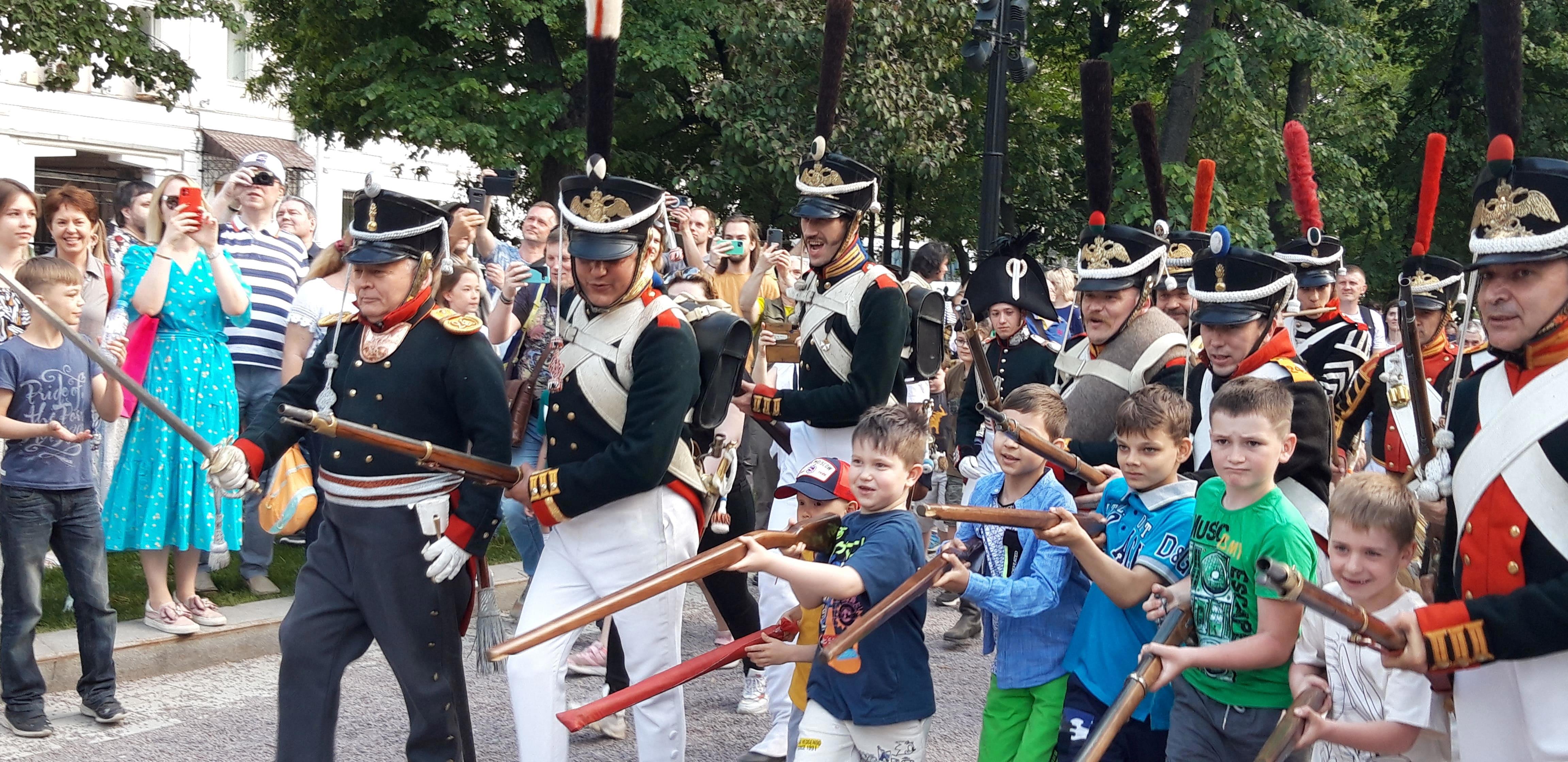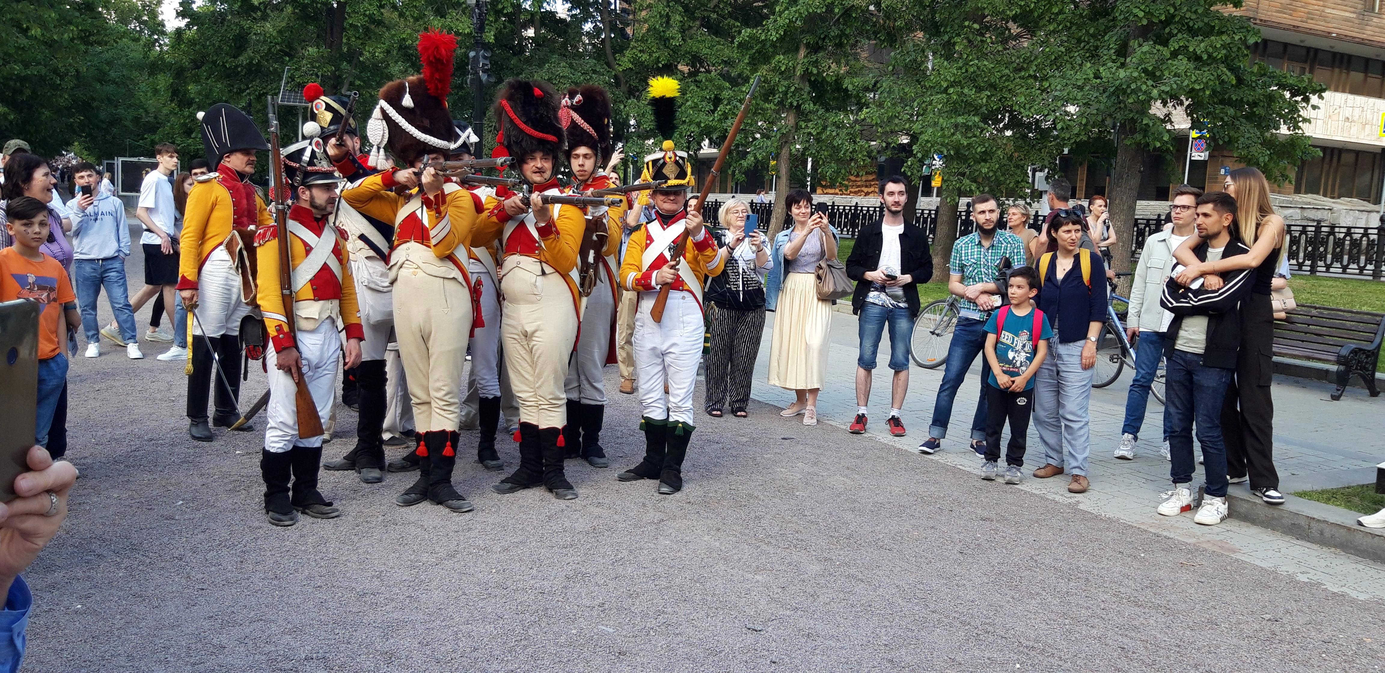 И вот мы уже во временах Петра I. За спиной памятника Пушкину, идёт постановка "Как царь Пётр арапа женил". Кажется, что бронзовый поэт даже немного морщится, не такое действо он себе представлял. А зрители - очень довольны и спектаклем, и актёрами, и возможностью в антракте сделать с актёрами фото на память: