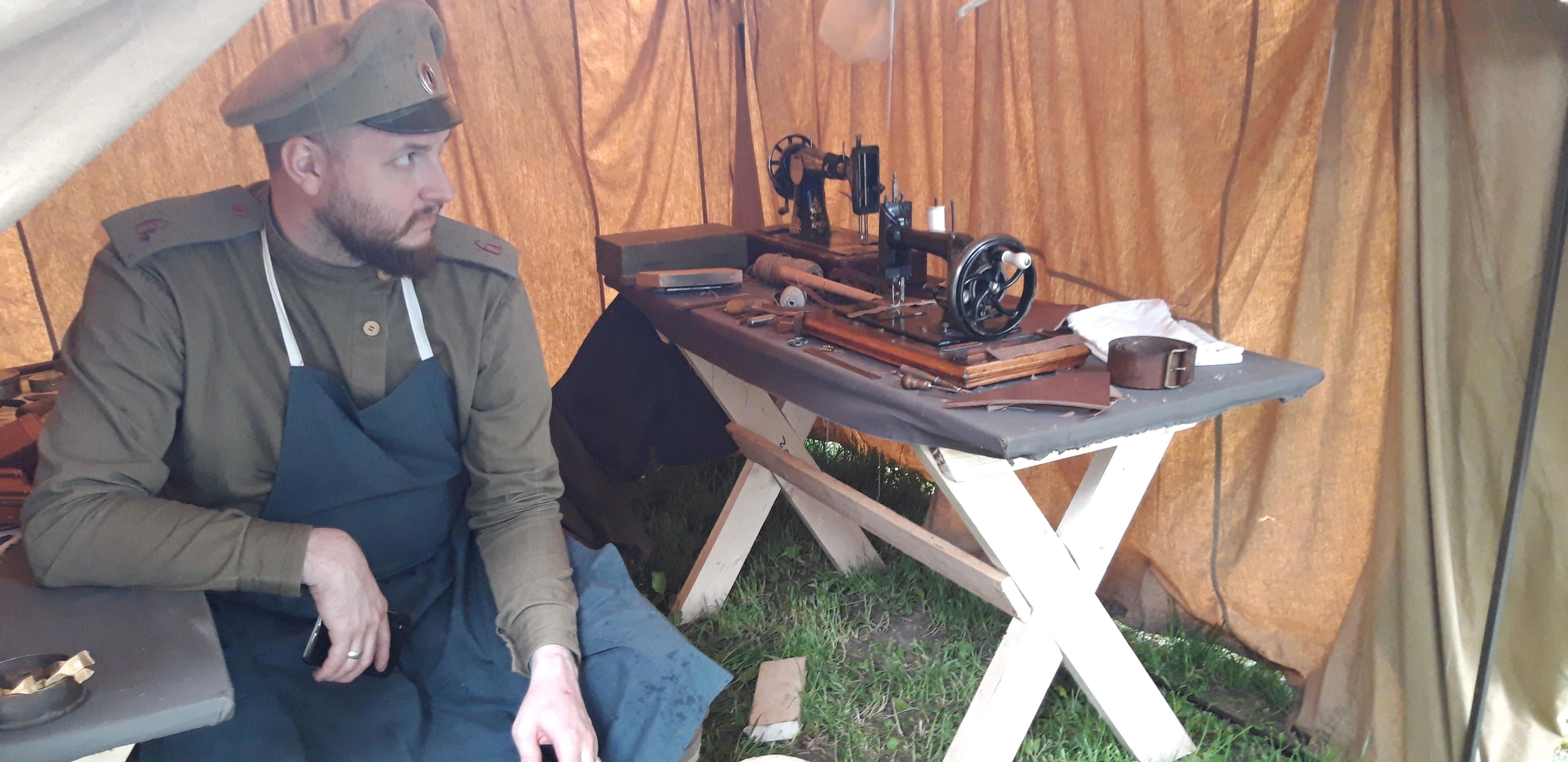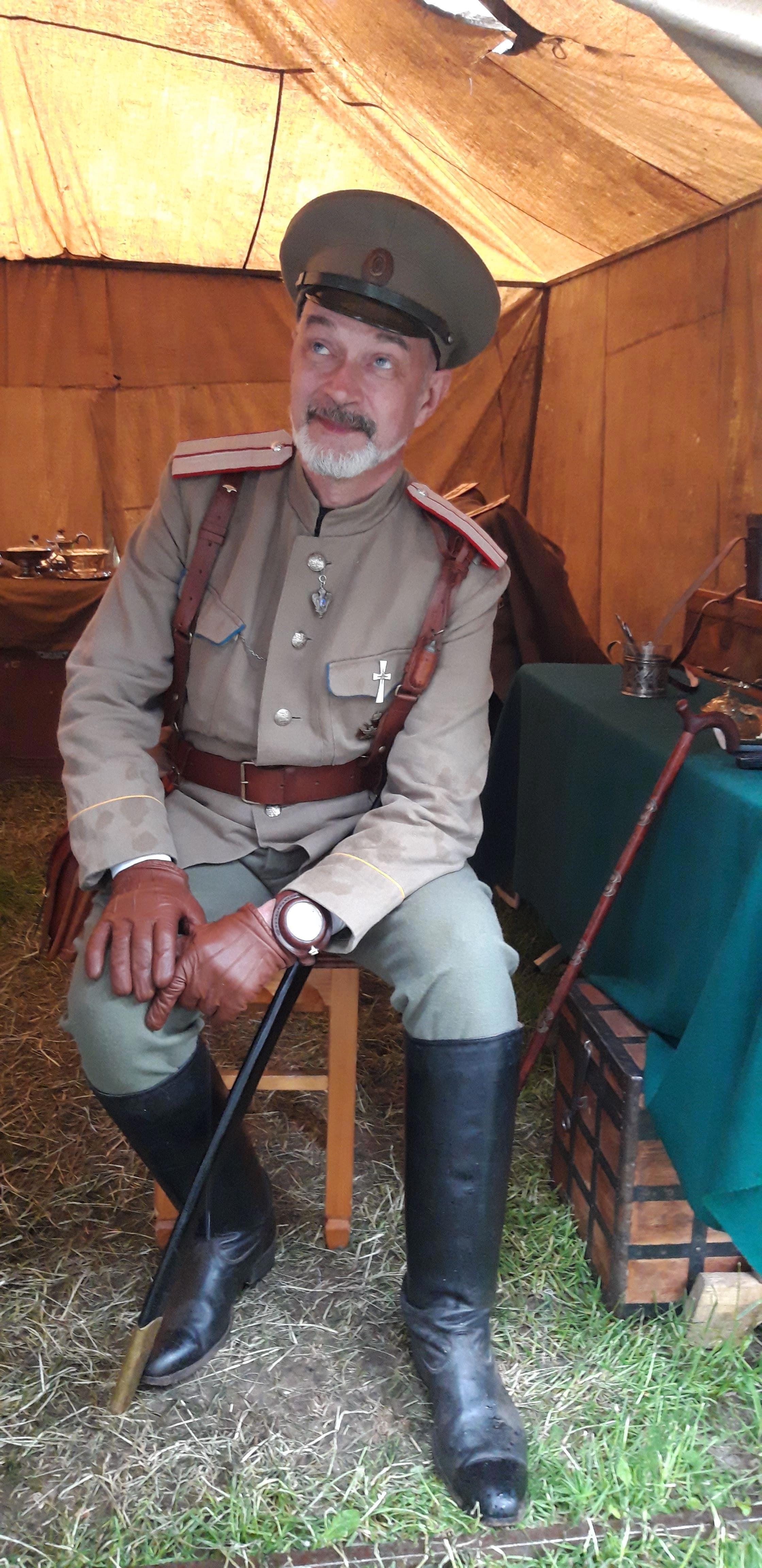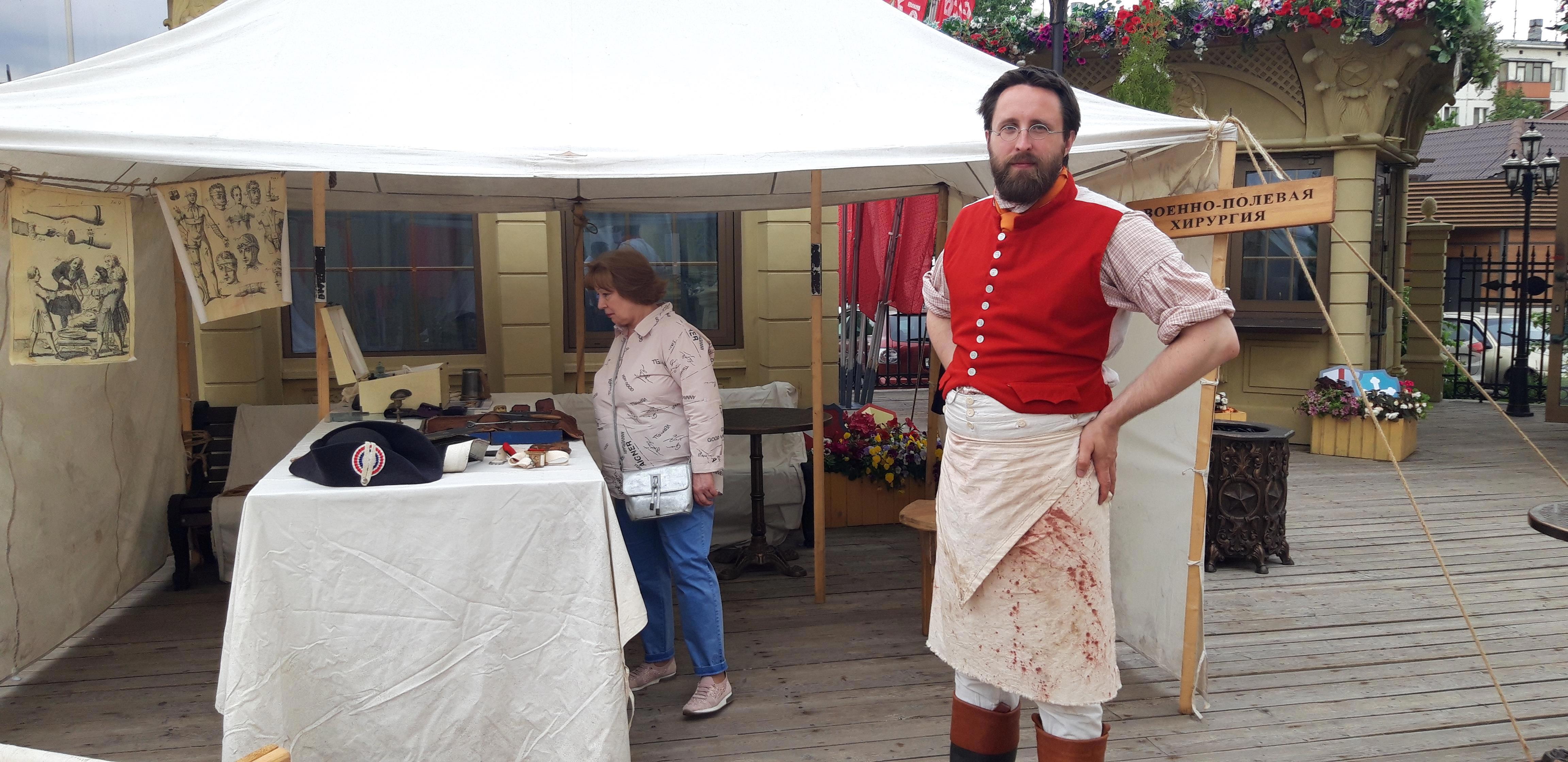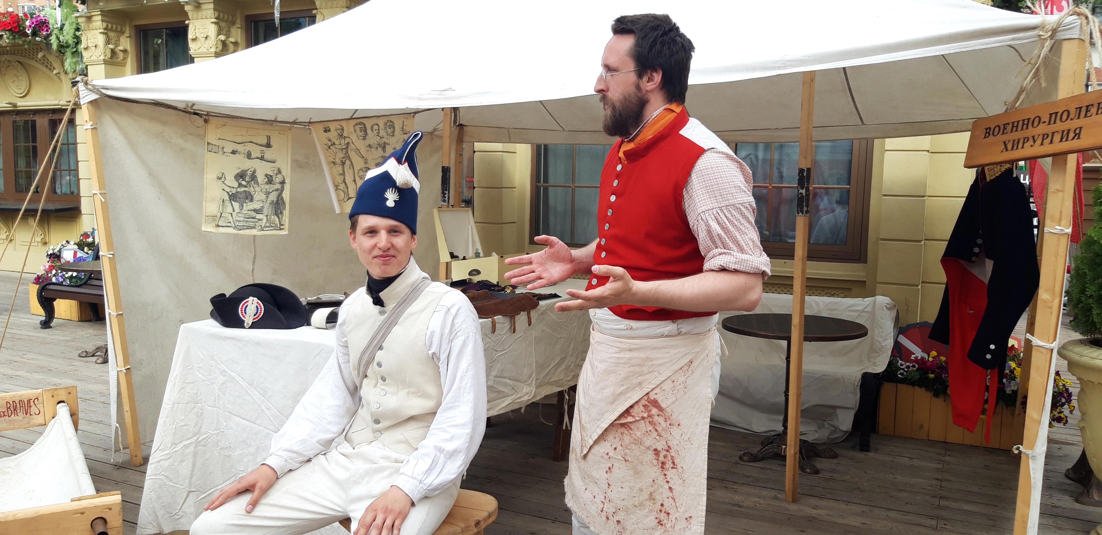 Фартук, залитый, со слов доктора, бутафорской кровью, антикварные медицинские инструменты, достаточно громкий голос, шутки во время ампутации... И вот "операция" удачно завершена, "пациент" будет жить, а вот воевать - вряд ли.