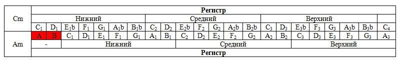 Я хотел продемонстрировать, что ноты разных тональностей могут находиться в разных регистрах, что следует учитывать при транспонировании. В то время, как все ноты тональности Cm находятся в одном регистре (на рисунке в среднем), в тональности Am ноты A и B располагаются в другом (на рисунке - в нижнем). Границей здесь является нота C. Зная данную особенность, построим для себя шпаргалку.