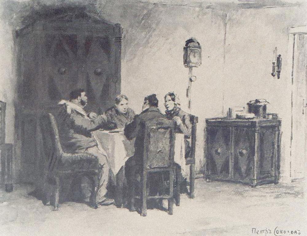 Обед у Собакевича. Черная акварель Петра Соколова к поэме Николая Гоголя «Мертвые души». Начало 1890-х годов