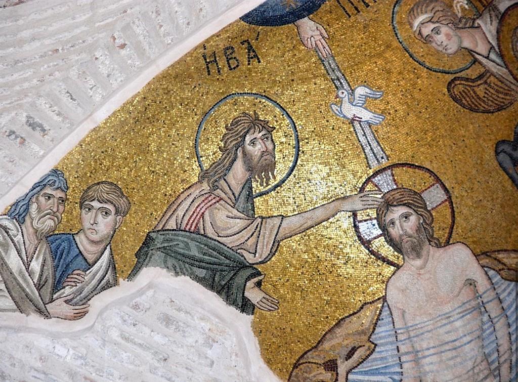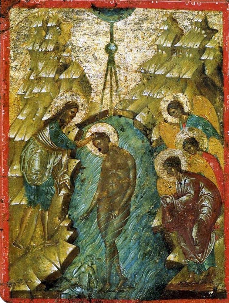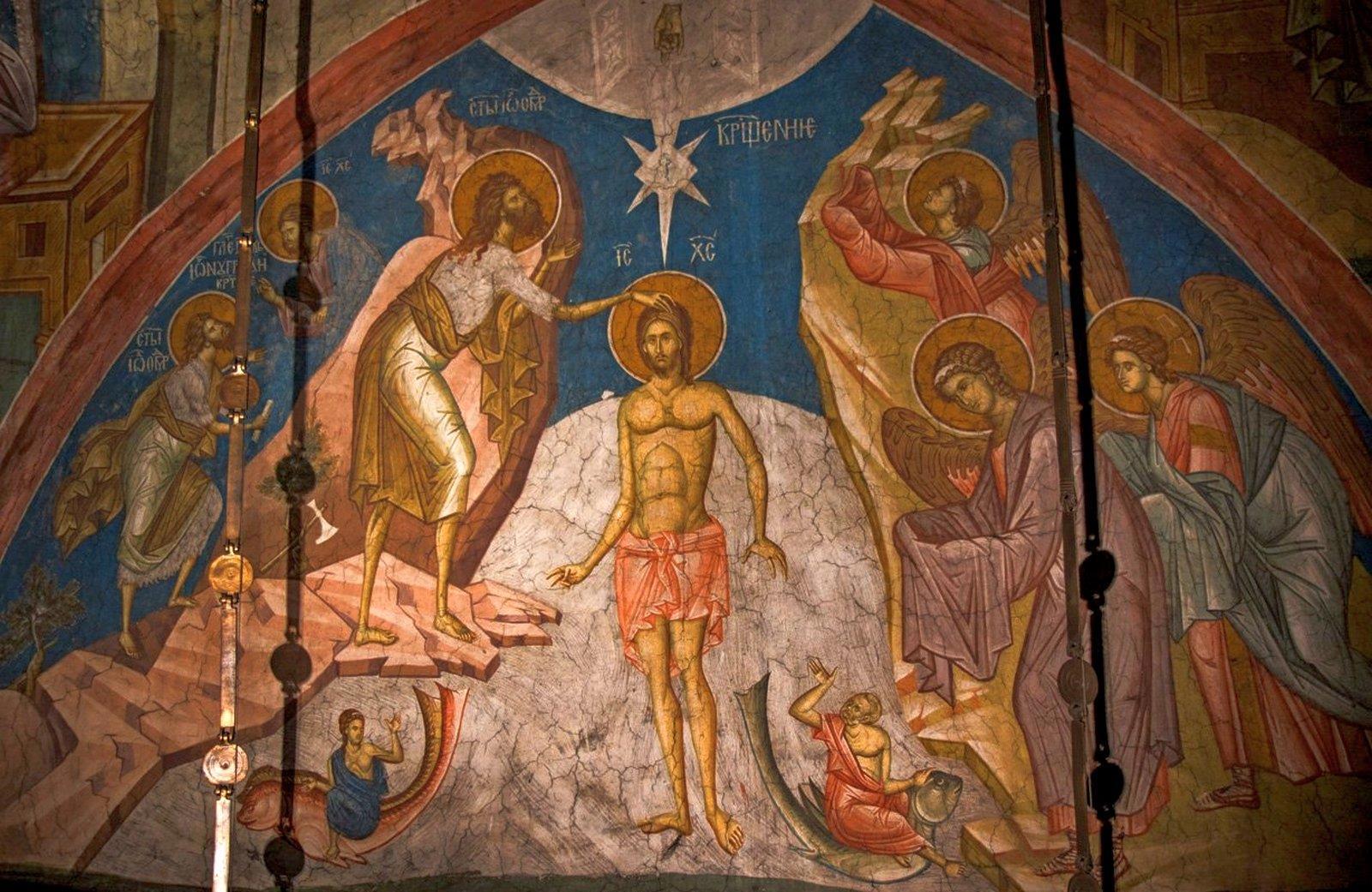 Много икон посвящено крещению Христа. Вот где должно быть всё просто и понятно. Обычно так и есть… в целом. Вот, например, «Крещение» из монастыря Дафни. Говорят, что это сделано в 12 веке, хотя я сильно в этом сомневаюсь: