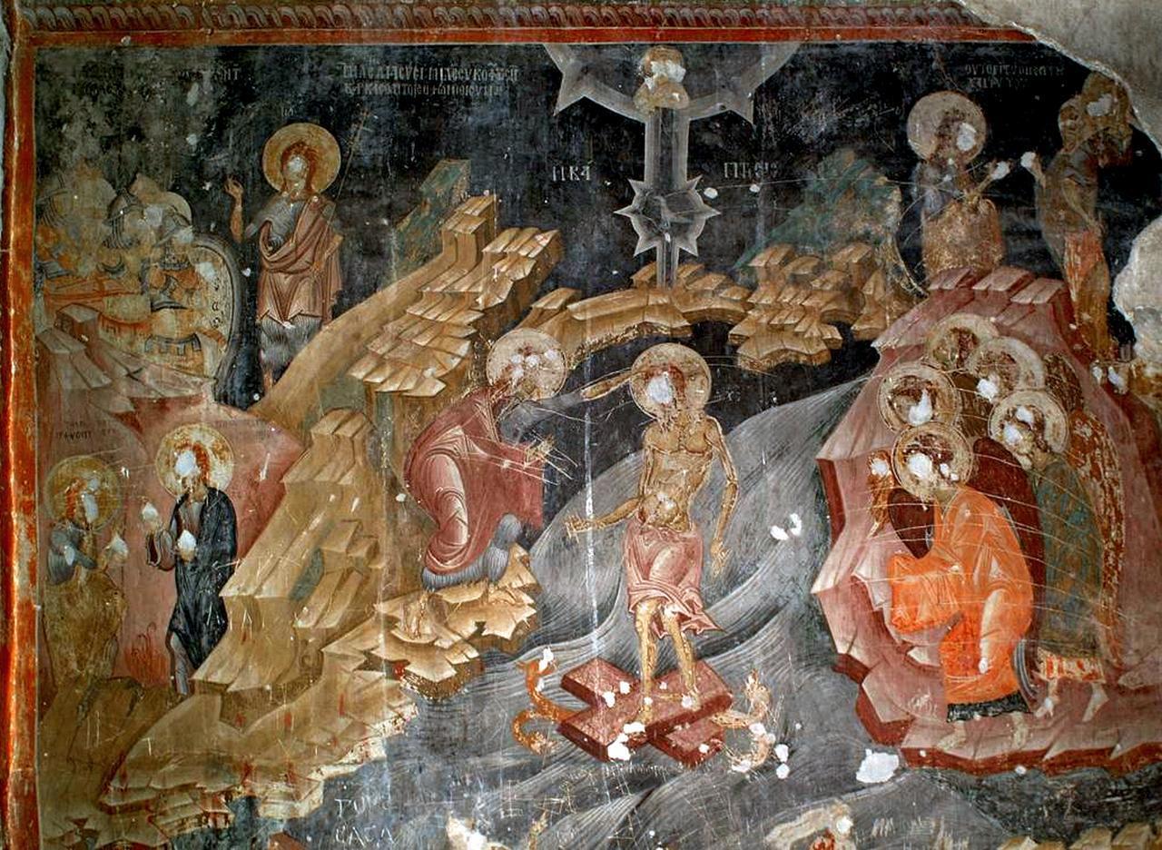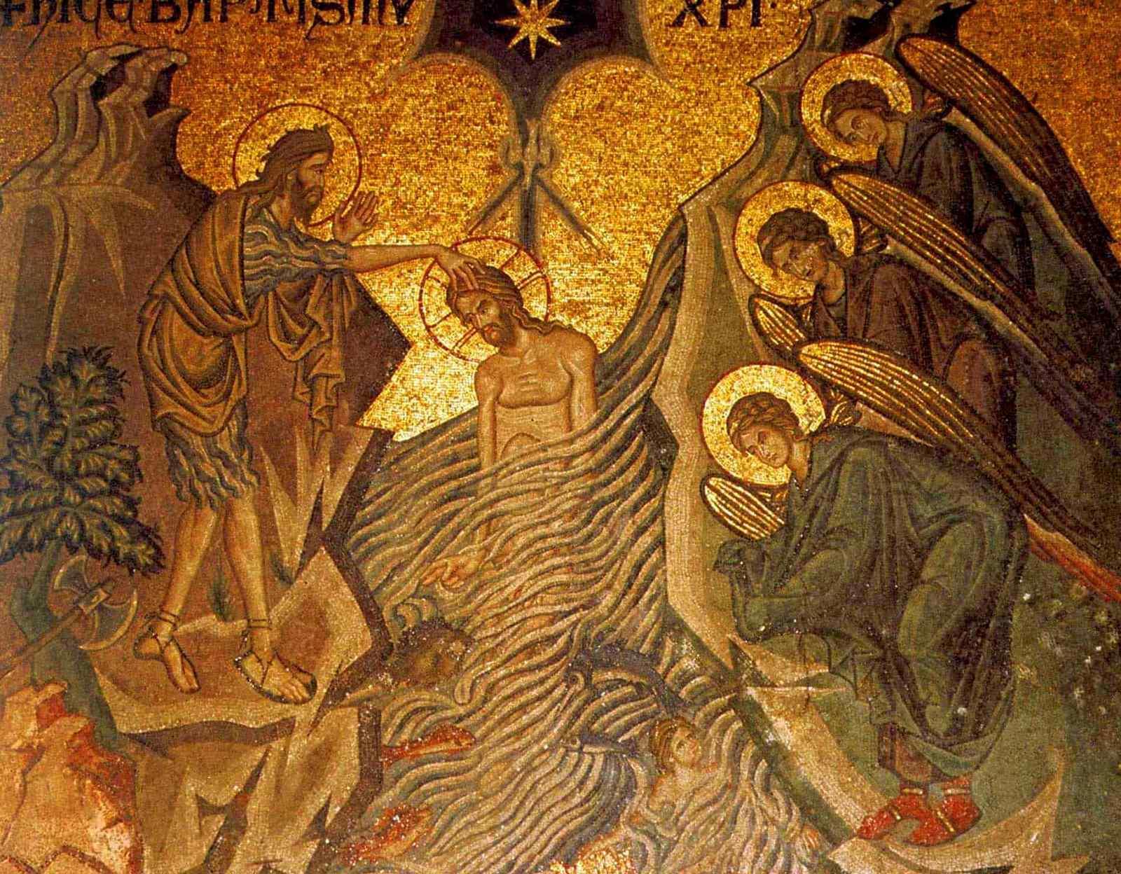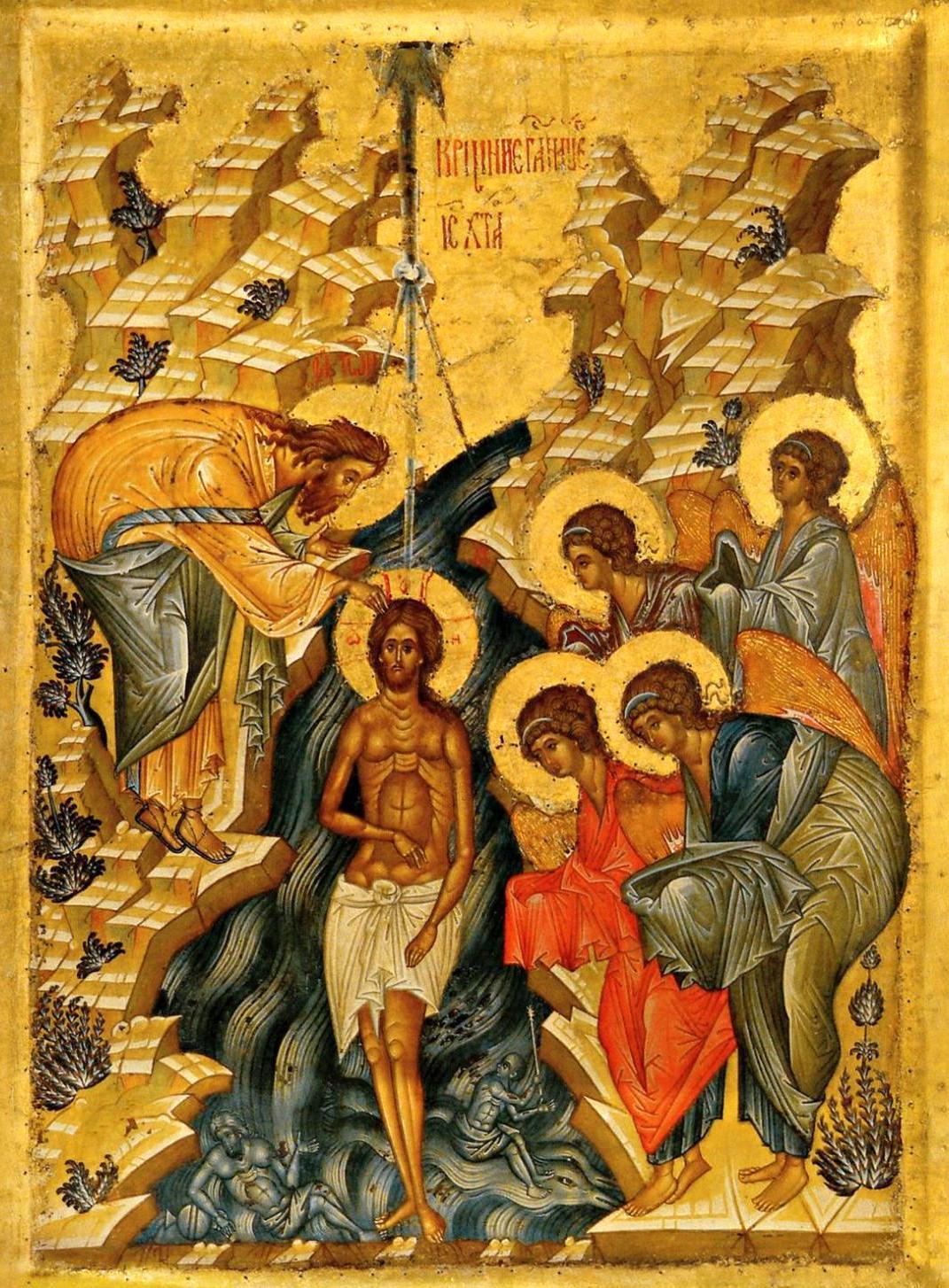 Много икон посвящено крещению Христа. Вот где должно быть всё просто и понятно. Обычно так и есть… в целом. Вот, например, «Крещение» из монастыря Дафни. Говорят, что это сделано в 12 веке, хотя я сильно в этом сомневаюсь:
