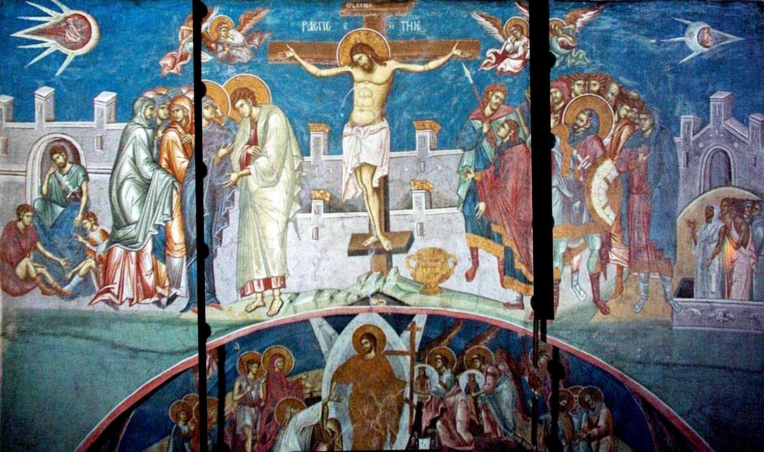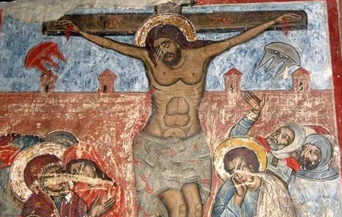 Ну, и наконец, пожалуй, самая нашумевшая фреска с «Распятием». Говорить про странные изображения, и не вспомнить про это «Распятие» просто невозможно. Оно родом из Косово. Вот эта картина: