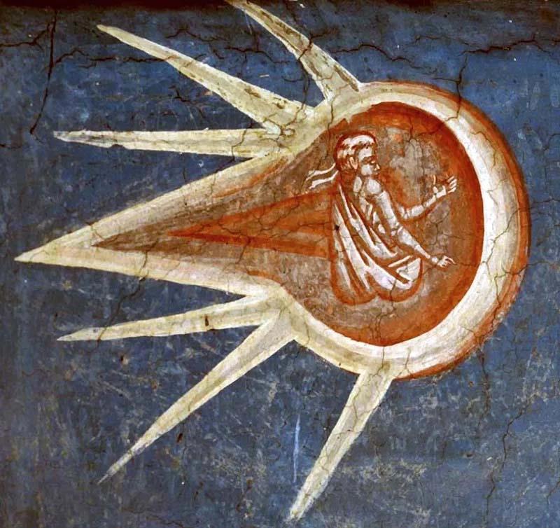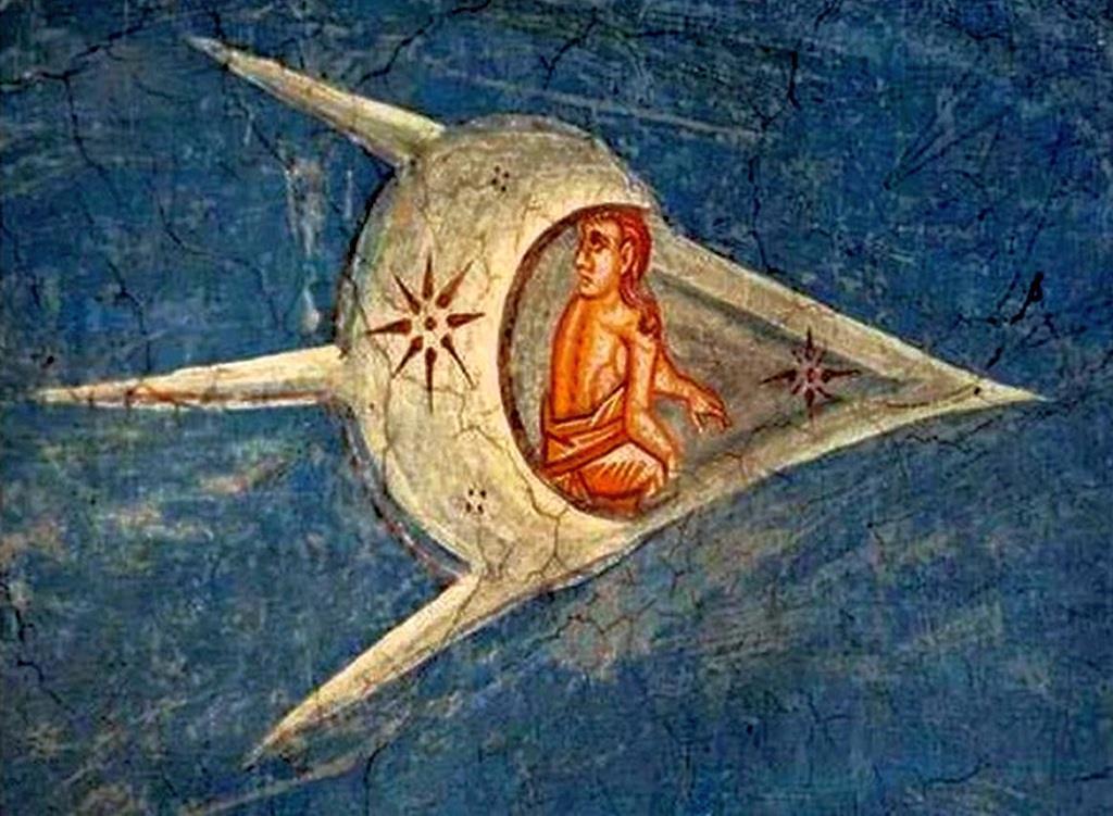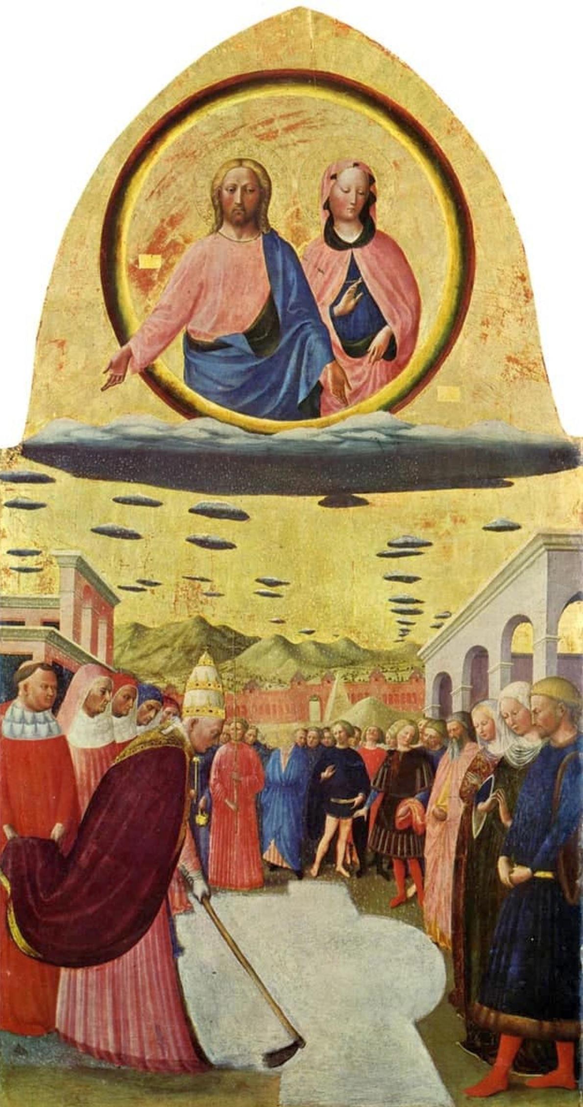 Это нарисовал в 15 веке художник по имени Мазолино де Паникале. Картина называется «Чудо снега». Посвящено редкому для тех мест явлению, которое церковь пропустить не могла, конечно. Кстати, исследователей сам по себе снег в южном регионе не очень заинтересовал (сейчас и не такое бывает), а вот то, что нарисовано в небе, немного озадачило. Действительно – и что это за «иллюминатор» такой, небесный, из которого выглядывают… боги? Кстати, а почему их двое?