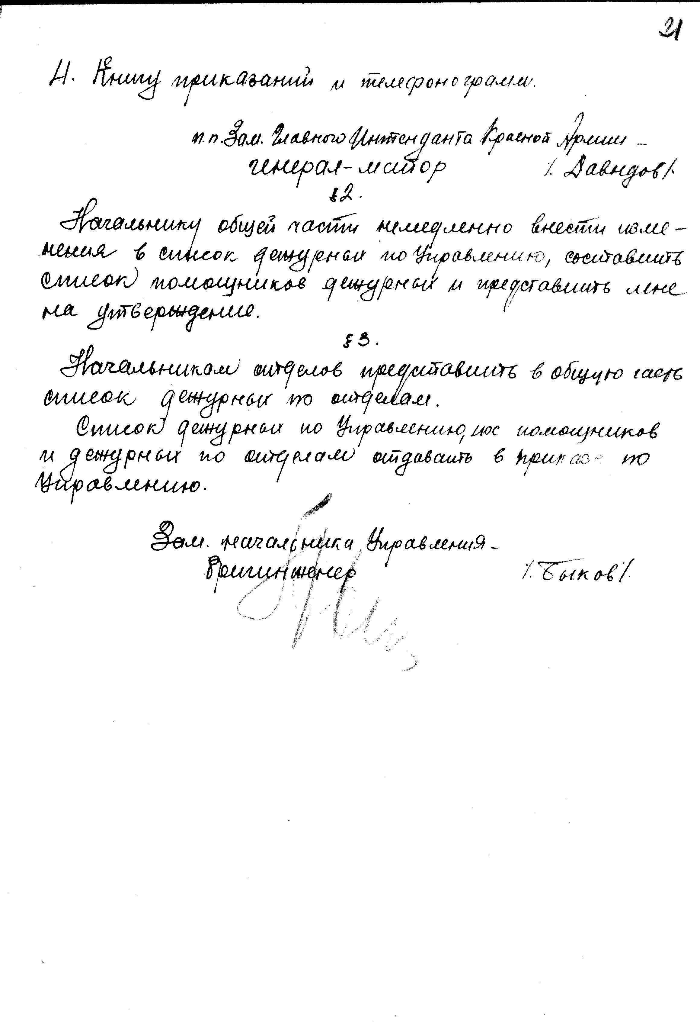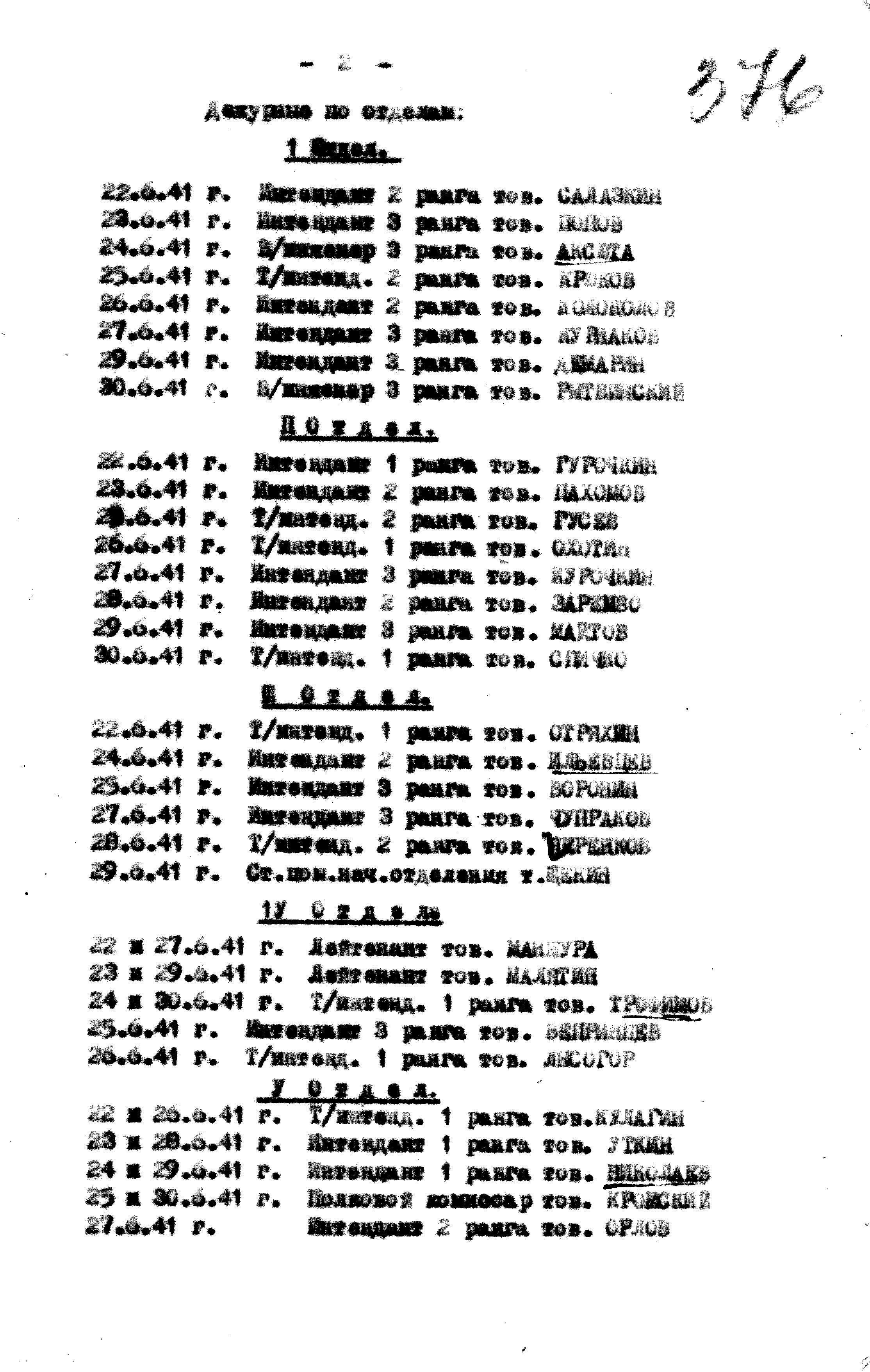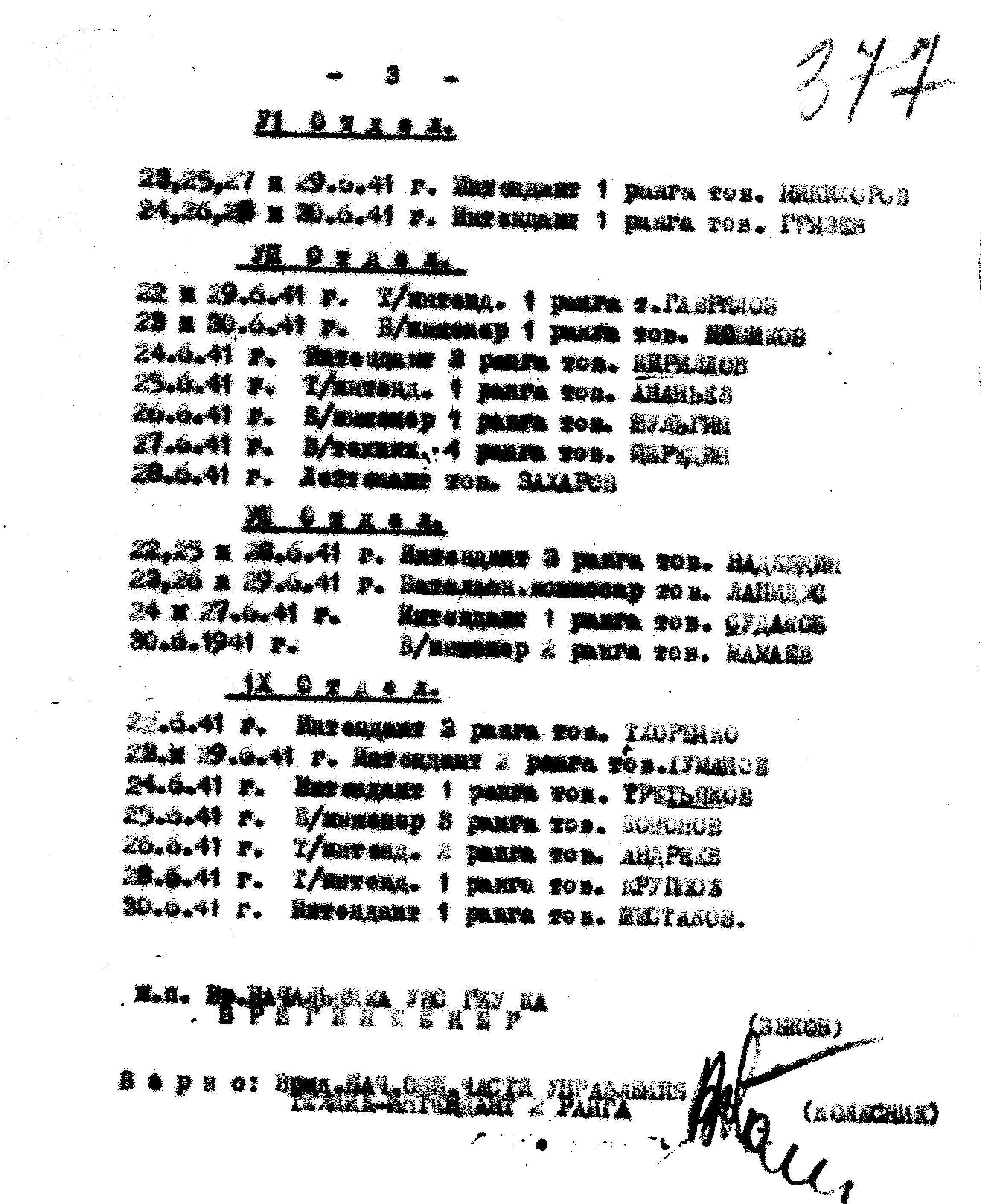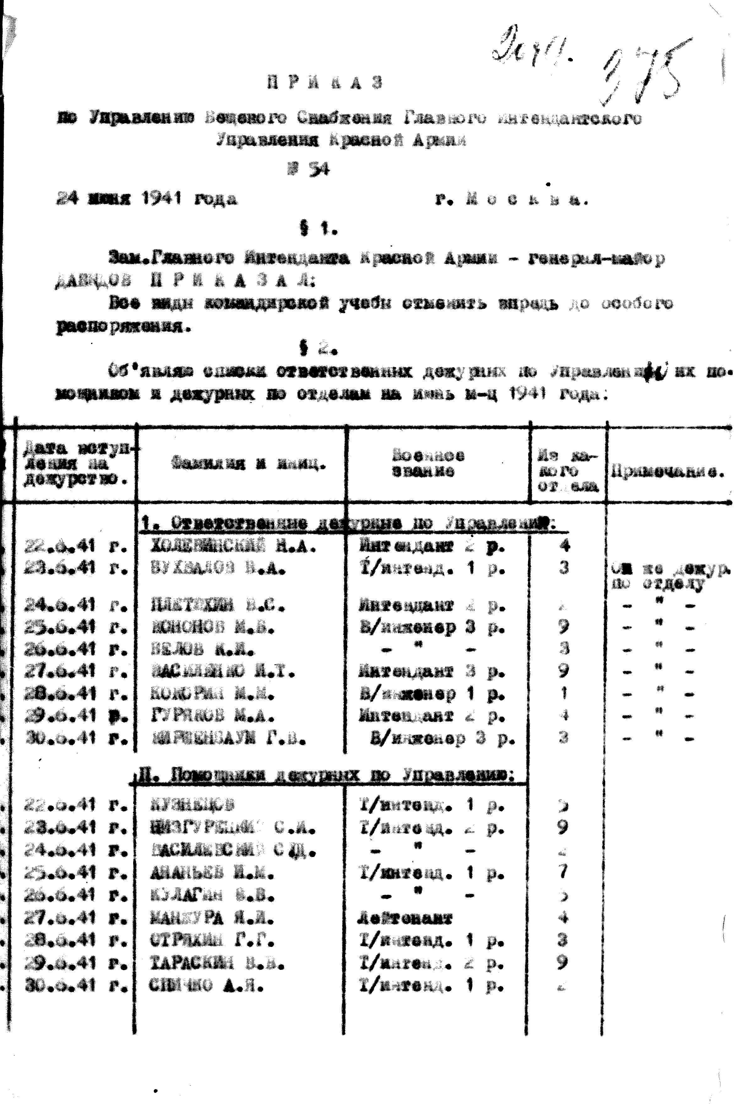 Сохранился и список, заступавших дежурными и помощниками дежурных по Управлению вещевого снабжения ГИнтУ, управлениям и отделам в самые первые дни Великой Отечественноё, с 22 по 30 июня 1941 г.