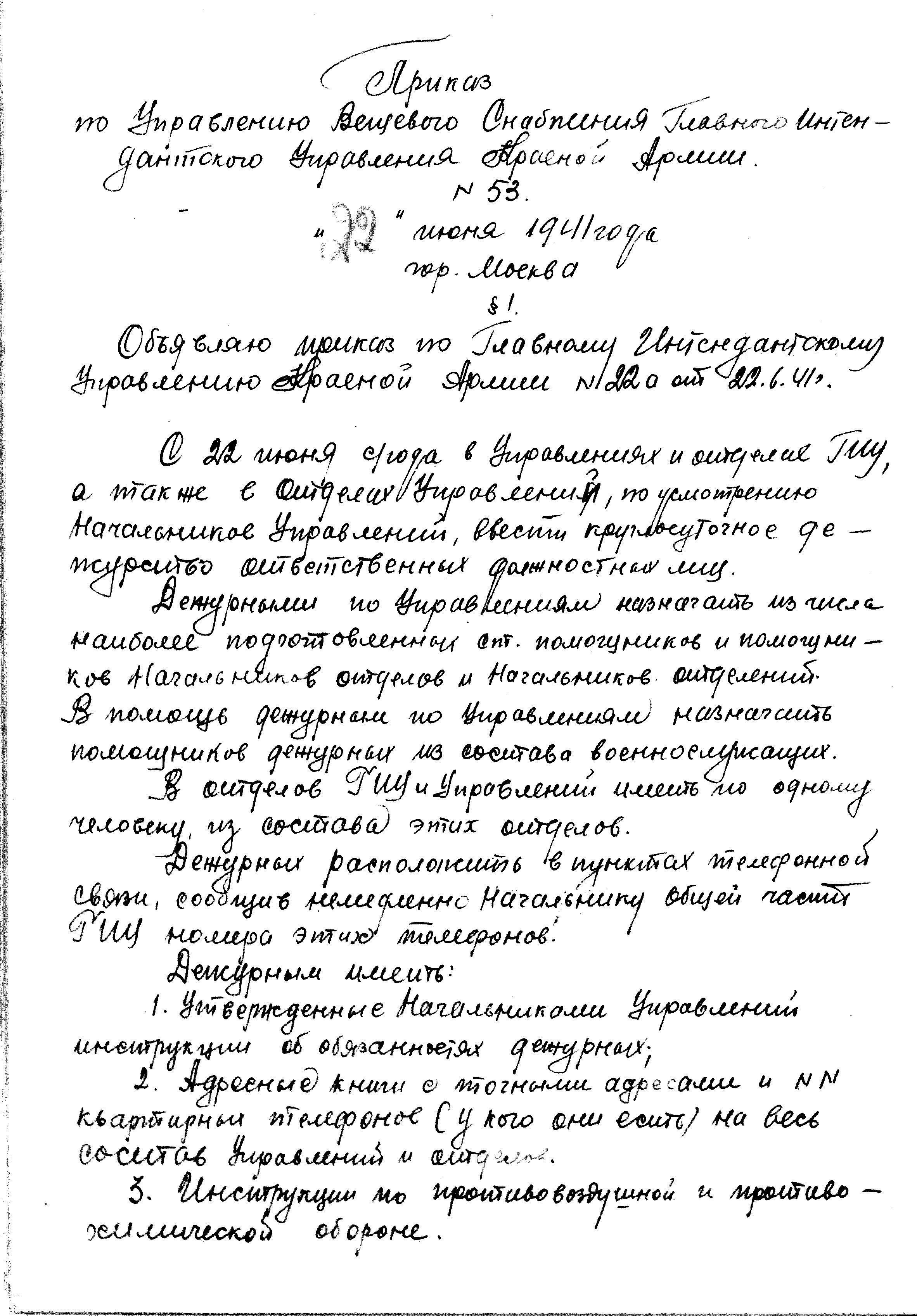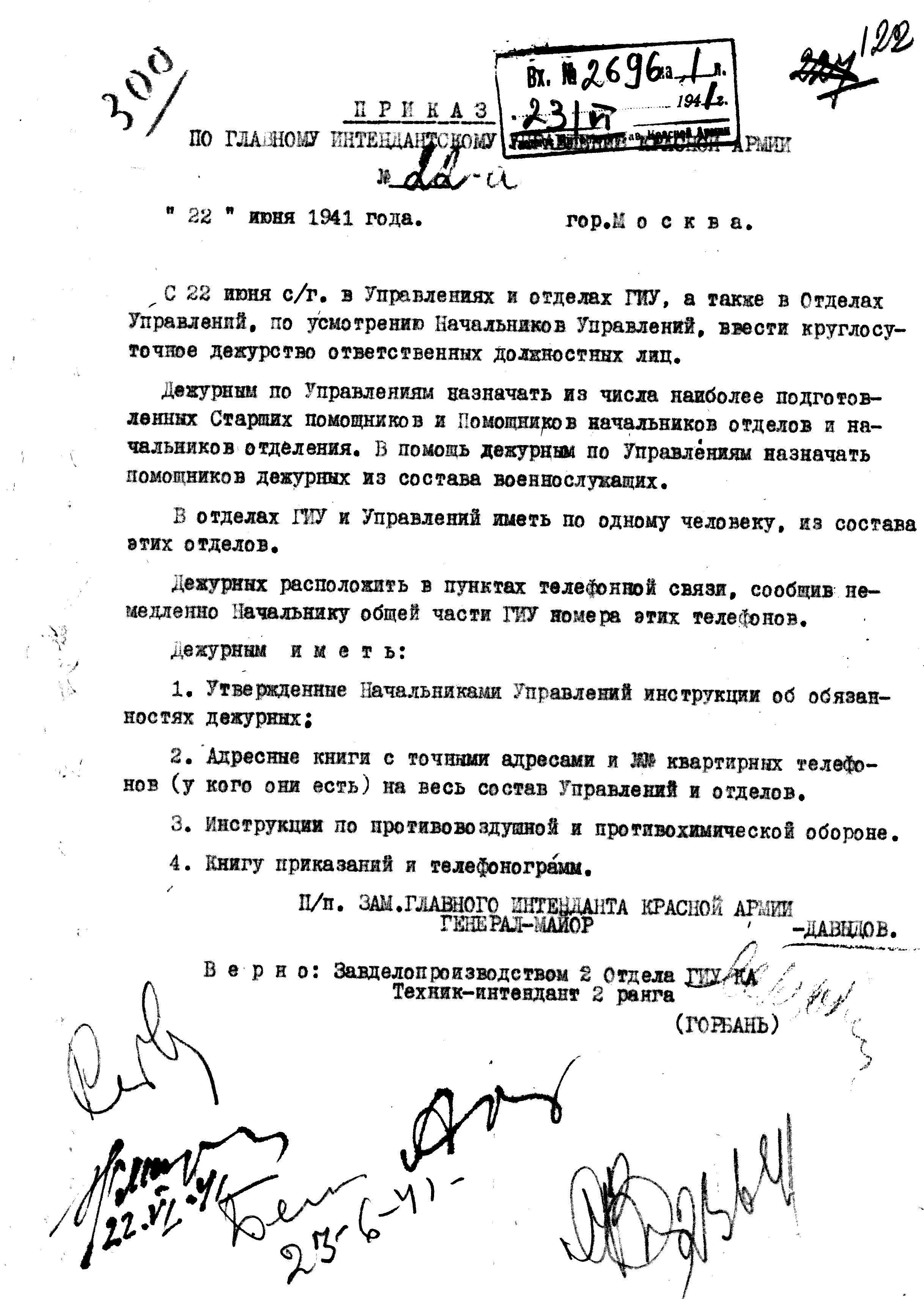 д/с: Приказ по личному составу Главного Интендантского Управления Красной Армии от 22 июня 1941 г.
