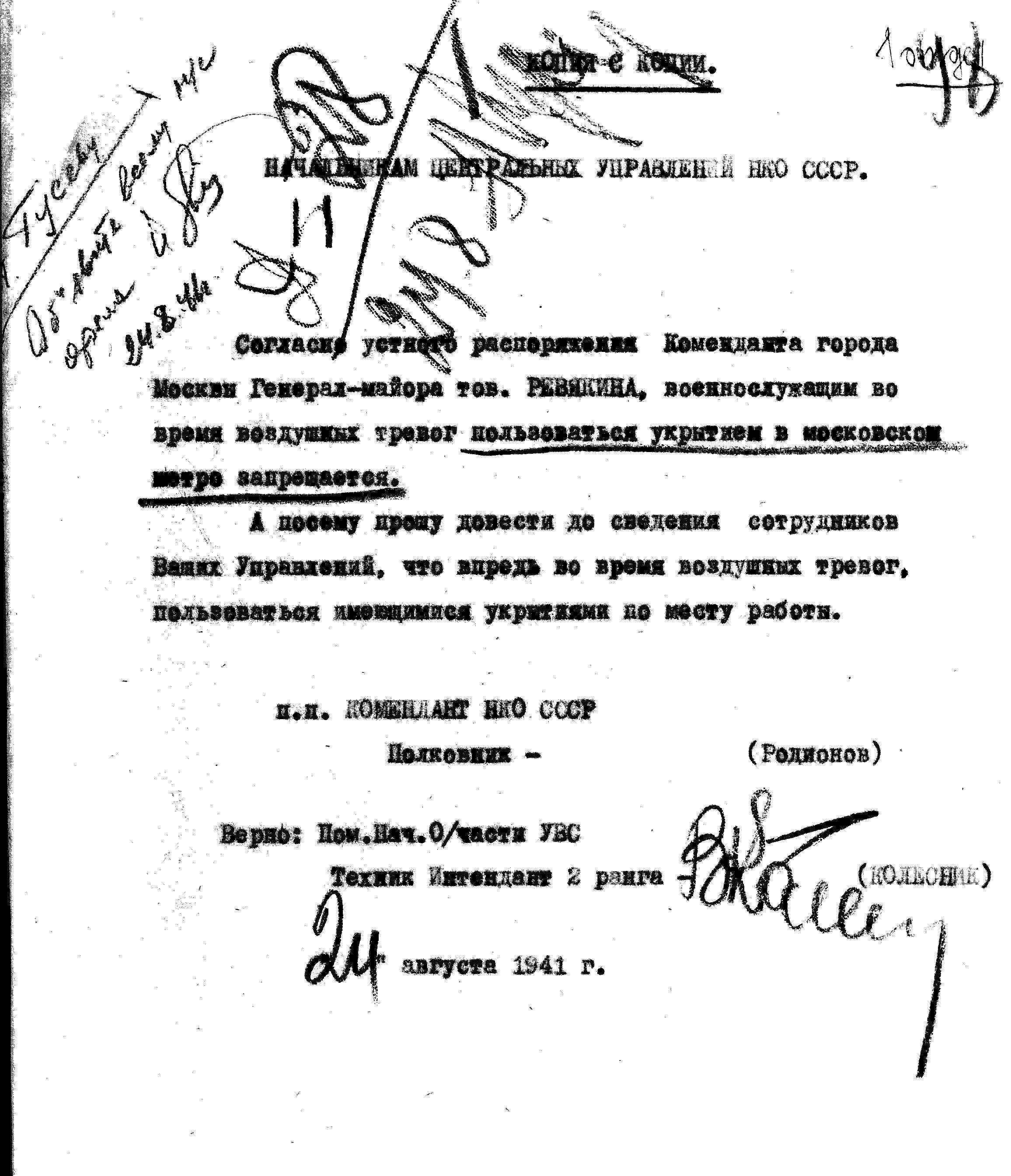 д/с: Копия с копии распоряжения Коменданта г. Москвы о запрете военнослужащим пользоваться укрытием в московском метро