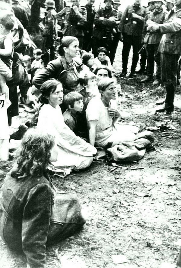 Старшая медсестра хирургического отделения госпиталя Брестской крепости Прасковья Леонтьевна Ткачева с женами и детьми командиров РККА в окружении немецких солдат.