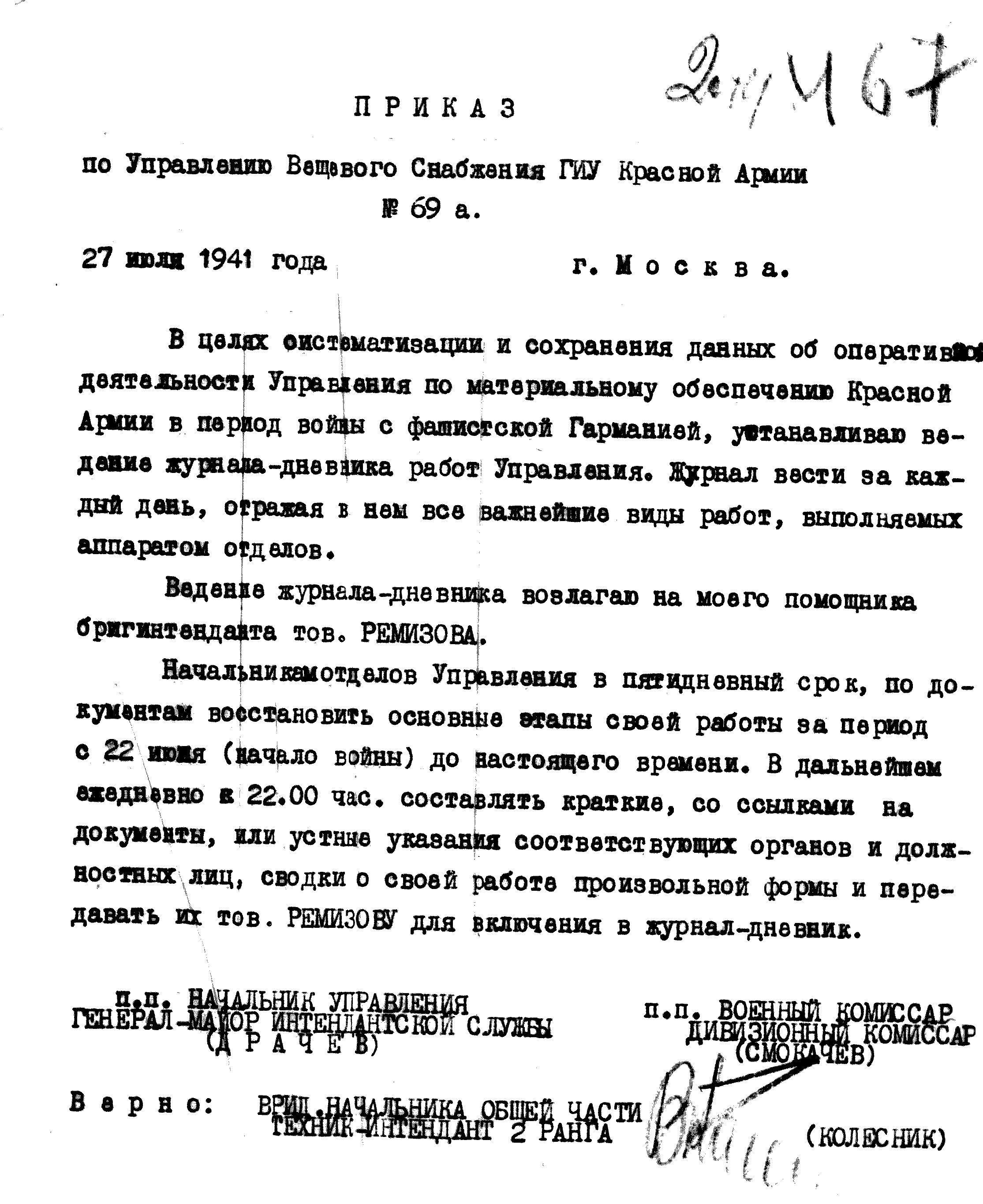 27 июля 1941 г., в соответствии с приказом начальника Управления Вещевого снабжения ГИУ КА началось ведения журнала-дневника. А сегодня, благодаря сохранившимся материалам в этот дневник, можно узнать о событиях, многие из которых не вошли в многочисленные издания, посвященные работе тыла в Великой Отечественной.