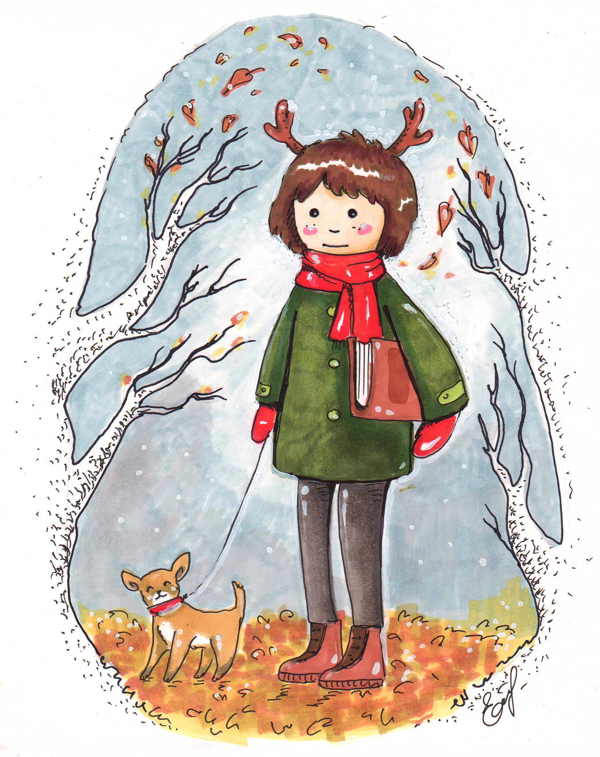 К поздравлениям присоединяется девочка-олененок, которая живет в лесу вместо со своей собачкой, собирает листья и читает книги.