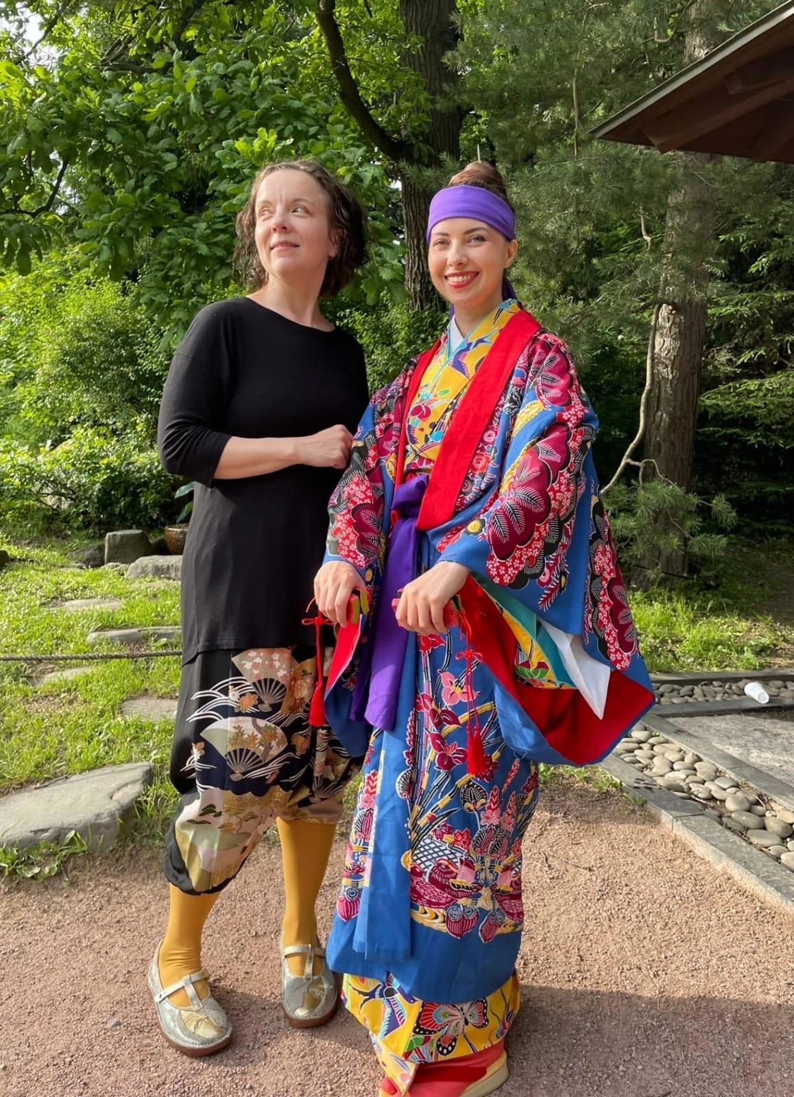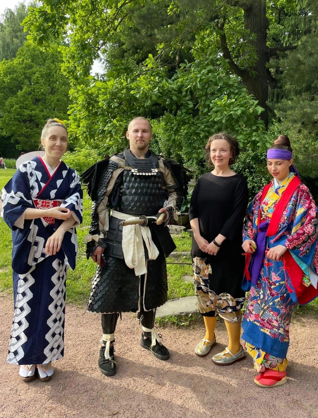 Настя рассказала об особенностях окинавской музыки, строя инструментов, о разнице дворцовой и народной музыки, я рассказала о бингата, об особенностях окинавского, очень особенного костюма - рюсо - и не менее особенного кицуке и одела Аню в костюм окинавской дворянки. И да, весь этот костюм держится на ОДНОМ косихимо, повязанно ПОД кимоно.