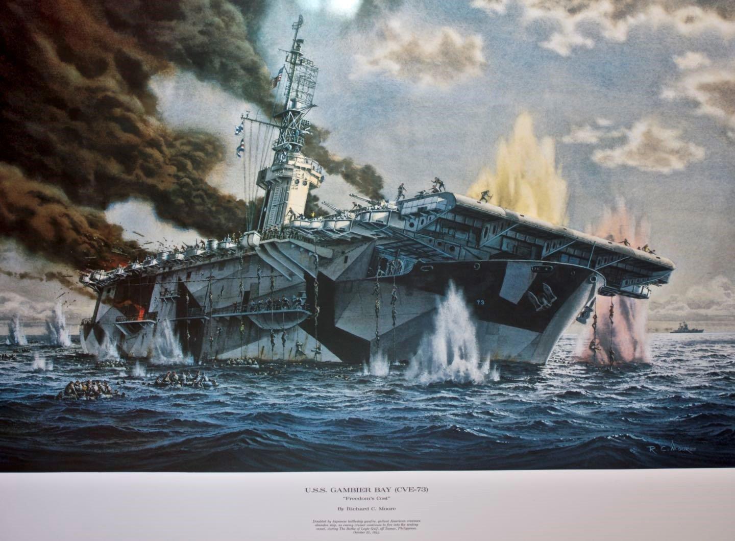 25 октября 1944 года шестнадцать «детских авианосцев» в заливе Лейте мирно бомбили японские позиции на Филлипинах. Торпед и бронебойных бомб этим отморозкам почти не выдали, опасаясь, что с них станется перетопить весь японский флот, не оставив ничего большим дядям. Несколько самолетов вообще загрузили пайками и прочей кока-колой, чтобы подкормить оголодавших десантников.