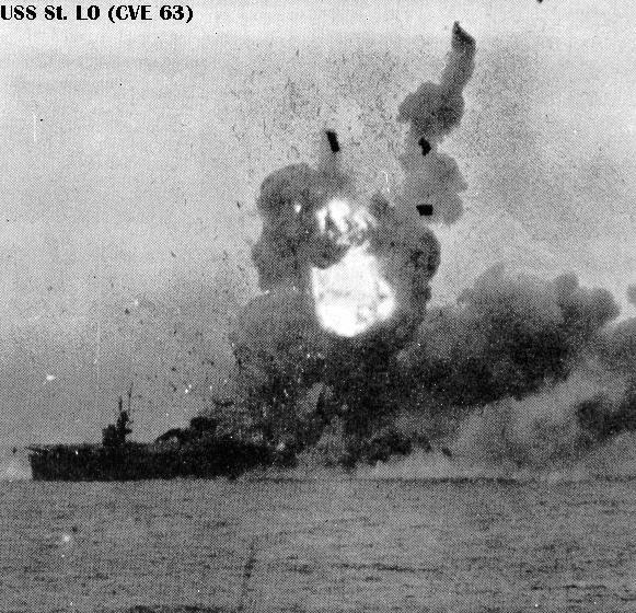 В считанные минуты камикадзе атаковали восемь «джипов». «Сумашедший русский» сумел уклониться, зато в «Калинин бей» влетело сразу два японца. Впрочем, он остался на плаву, а вот «Сент ло» не повезло – если японский самолет просто размазало тонким слоем по палубе, то его бомба взорвалась в ангаре, а там заправленные самолеты, свои бомбы, торпеды…