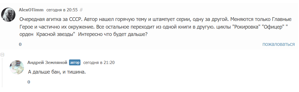 Прочел цикл "Орден Красной Звезды" и оставил мнение в комментариях Скрин ниже. Из-за чего тут же угодил в бан этого автора.