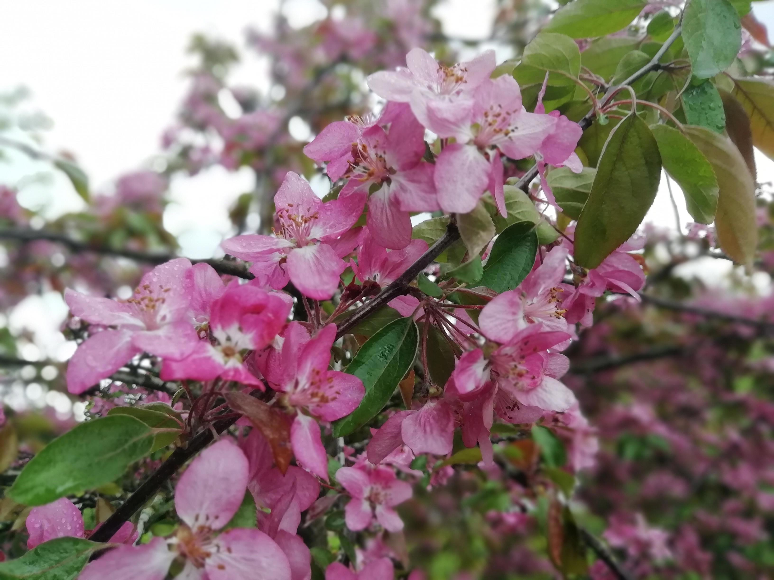 А это декоративная яблоня - правда, не у нас, это у тёщи на даче. Тоже надо бы такую посадить - жаль, цветёт мало: