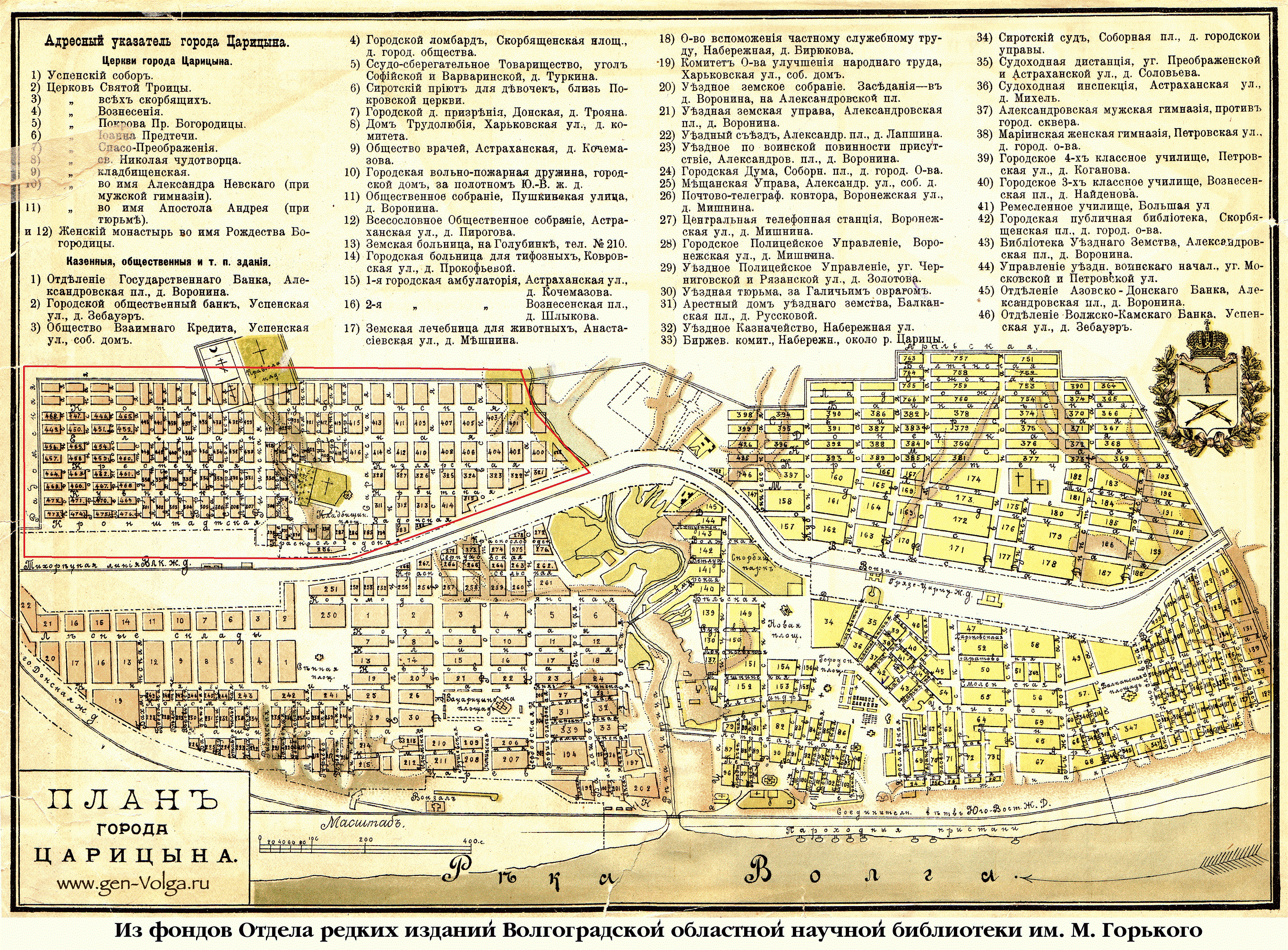 Автор: ЛиСиЦаДля того, чтобы понять размеры Дар-горы (Вор-горы), достаточно отметить её на плане Царицына начала двадцатого века - она обведена красным: