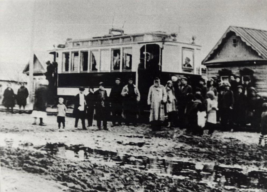 Рядом со зданием видны рельсы, но это не железнодорожные - железная дорога проходит по другую сторону, а трамвайные. Первый маршрут трамвая в Царицыне был открыт в 1913 году именно так, чтобы облегчить доступ ко всем трём существовавшим тогда вокзалам, и связал Дар-гору с нижней частью Города. Посмотрите, с каким удовольствием люди от мала до велика фотографировались рядом с новым "чудо-транспортом":