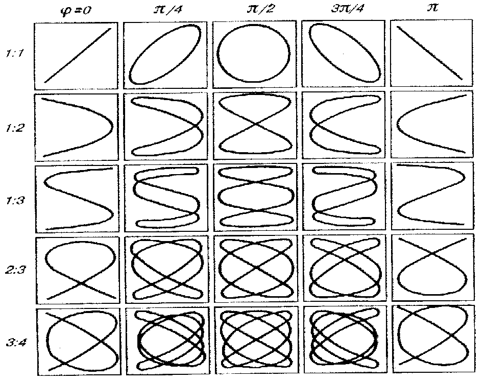Вид фигур зависит от соотношения между периодами (частотами), фазами и амплитудами обоих колебаний. В простейшем случае равенства обоих периодов фигуры представляют собой эллипсы, которые при разности фаз 0 или. вырождаются в отрезки прямых, а при разности фаз.