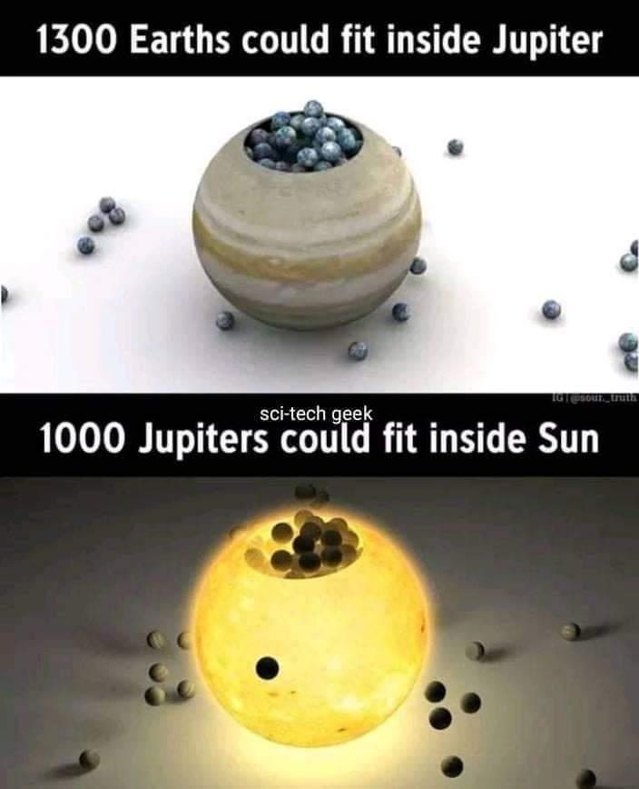 Просто симпатичное сравнение размеров. 1300 поанет Земля поместися в Юпитере. Тысяча Юпитеров поместится в Солнце.