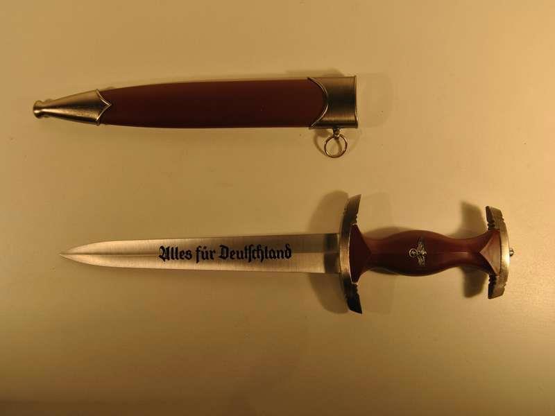 Более известен кинжал войск СС - взятый практически из средневековья, копирован швейцарский гольбейн. Очень характерная форма. И украшен надписями на лезвии - "Моя честь - верность!" и "Все для Германии".