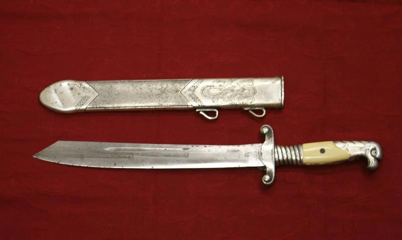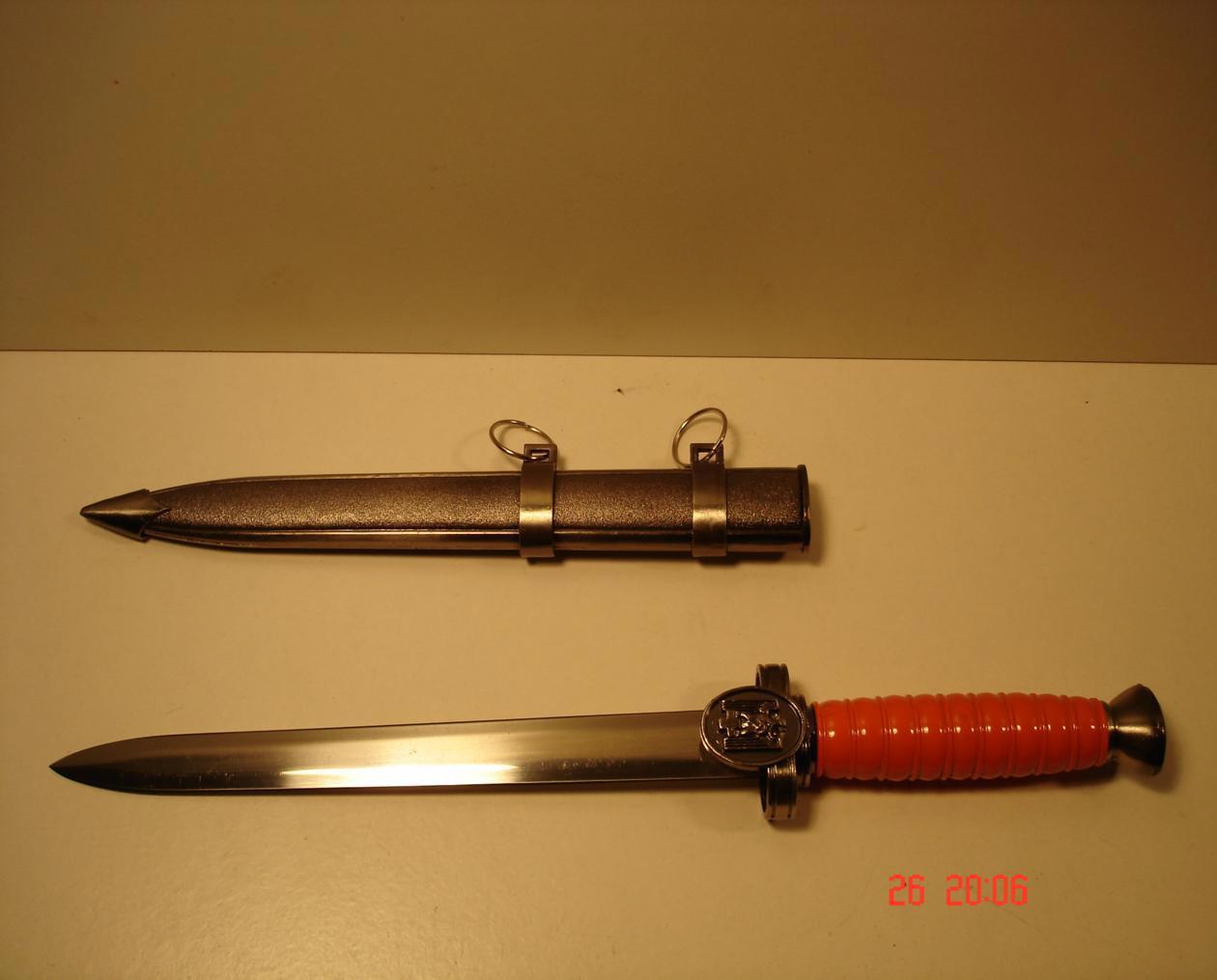 Это офицерский кинжал военизированной организации Имперской рабочей службы (Доармейская подготовка, типа нашего ДОСААФ,) Для рядовых членов - попроще исполнением, черного цвета. Леха нашел стыренный у кого-то именно такой - и да, я с Лехой согласен - дизайн этого кинжала и впрямь какой-то орочий))).