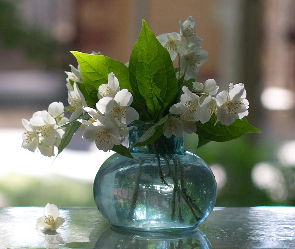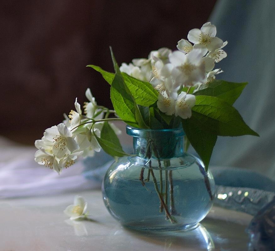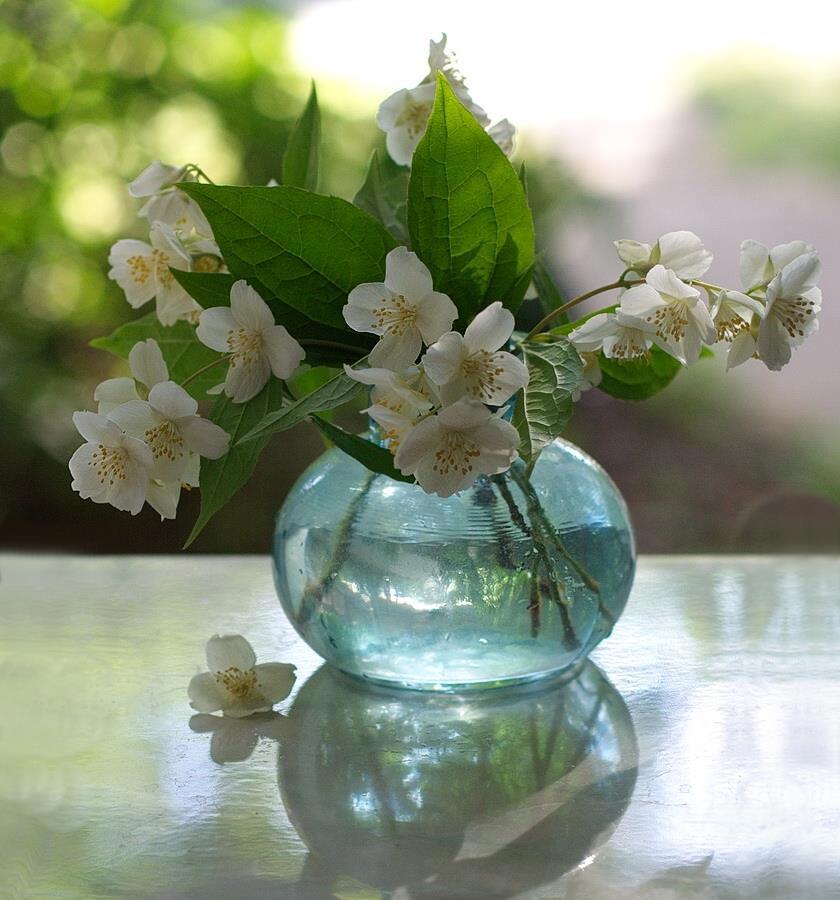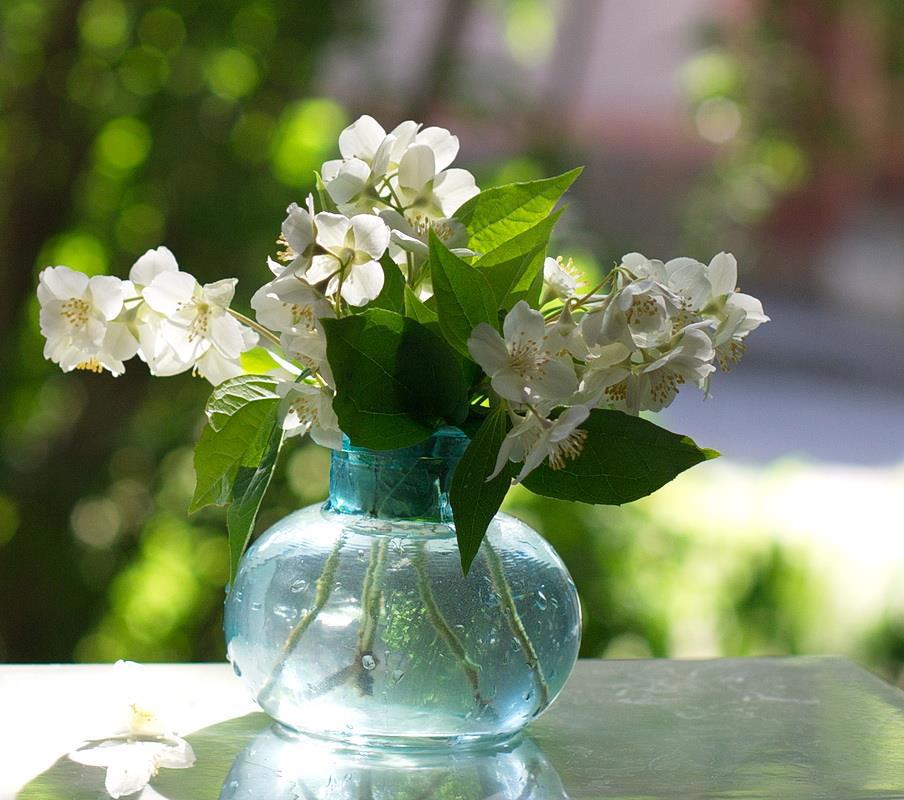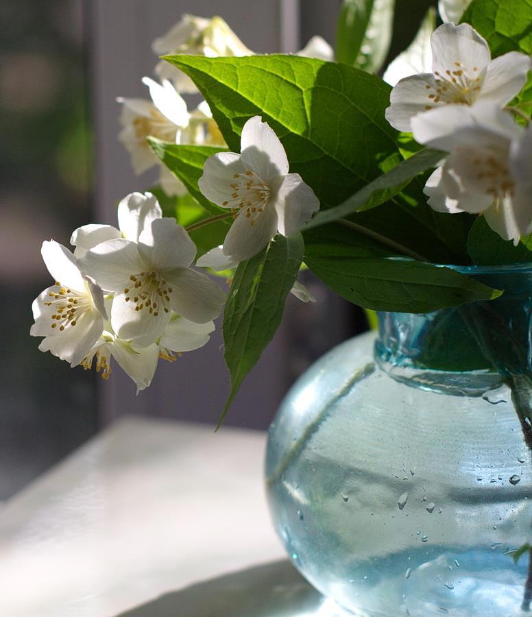 Автор: Ольга ЛевоновичВосхищают цветы, стеклянные ёмкости с водой и солнце. Тут всё вместе собралось. В комнате головокружительный запах. Цветёт чубушник, в народе называемый жасмином. На самом деле жасмин относится к маслиновым растениям, а чубушник - к гортензиевым. Небольшая фотосессия.