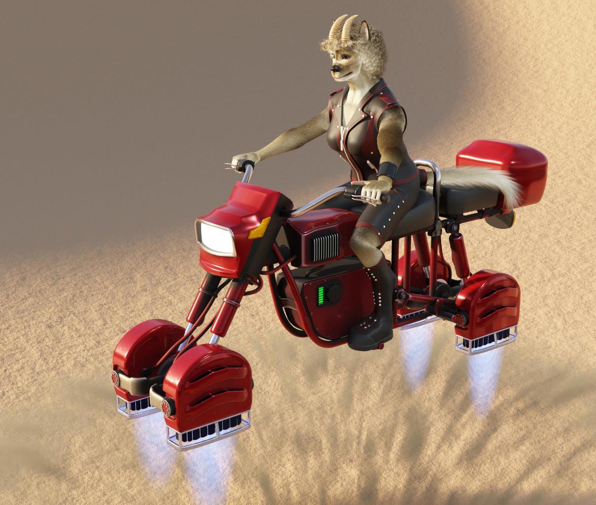 Восстанавливая мотоцикл, Коза решила, что лапки лапками, но вокруг куча летающих машин (летающих мотоциклов почти нет), а раз от любимой игрушки осталась только рама, то пора бы и проапгрейтить её. Тем более, что похожий на киберпанк сеттинг предусматривает возможность древние железяки кардинально обновлять, а не выбрасывать. Потому были доступны дешёвые и практичные модули для установки на место колёс в старые авто (потому у них округлая форма сверху).