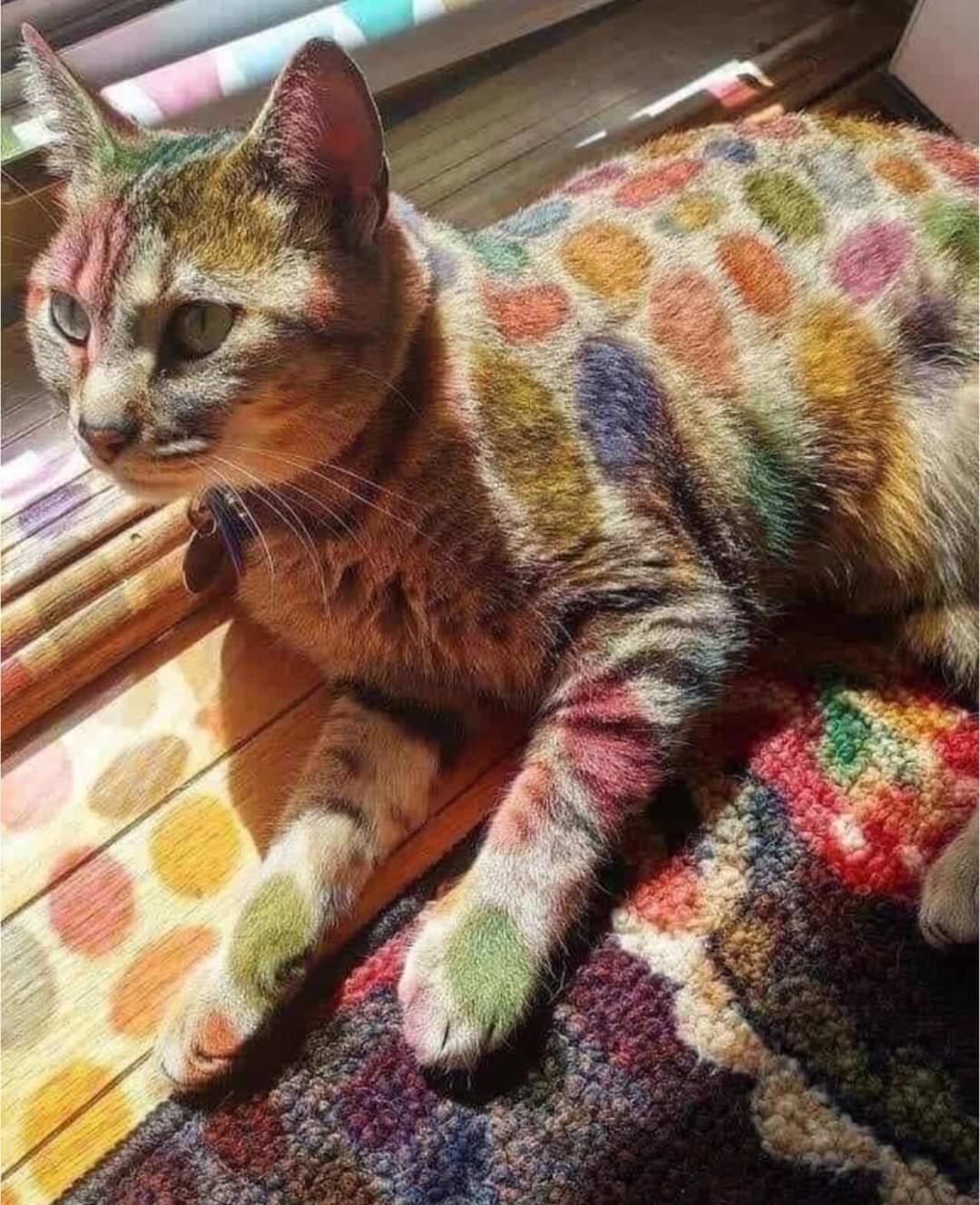 Кота "раскрасили" цветной витраж в окне и солнышко. :)