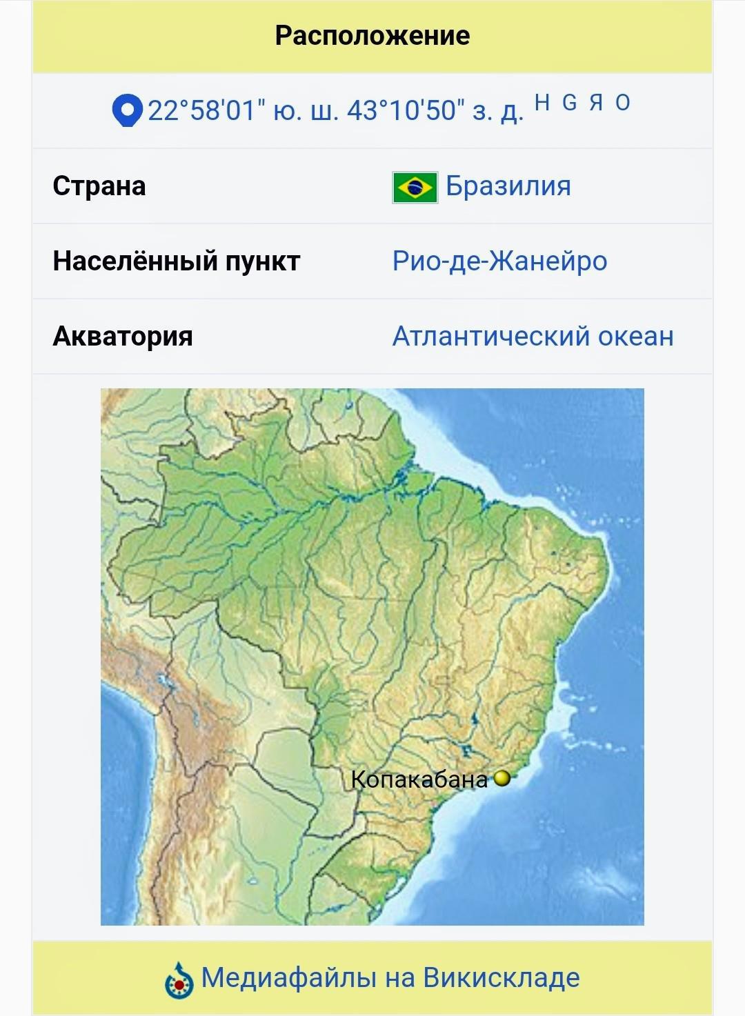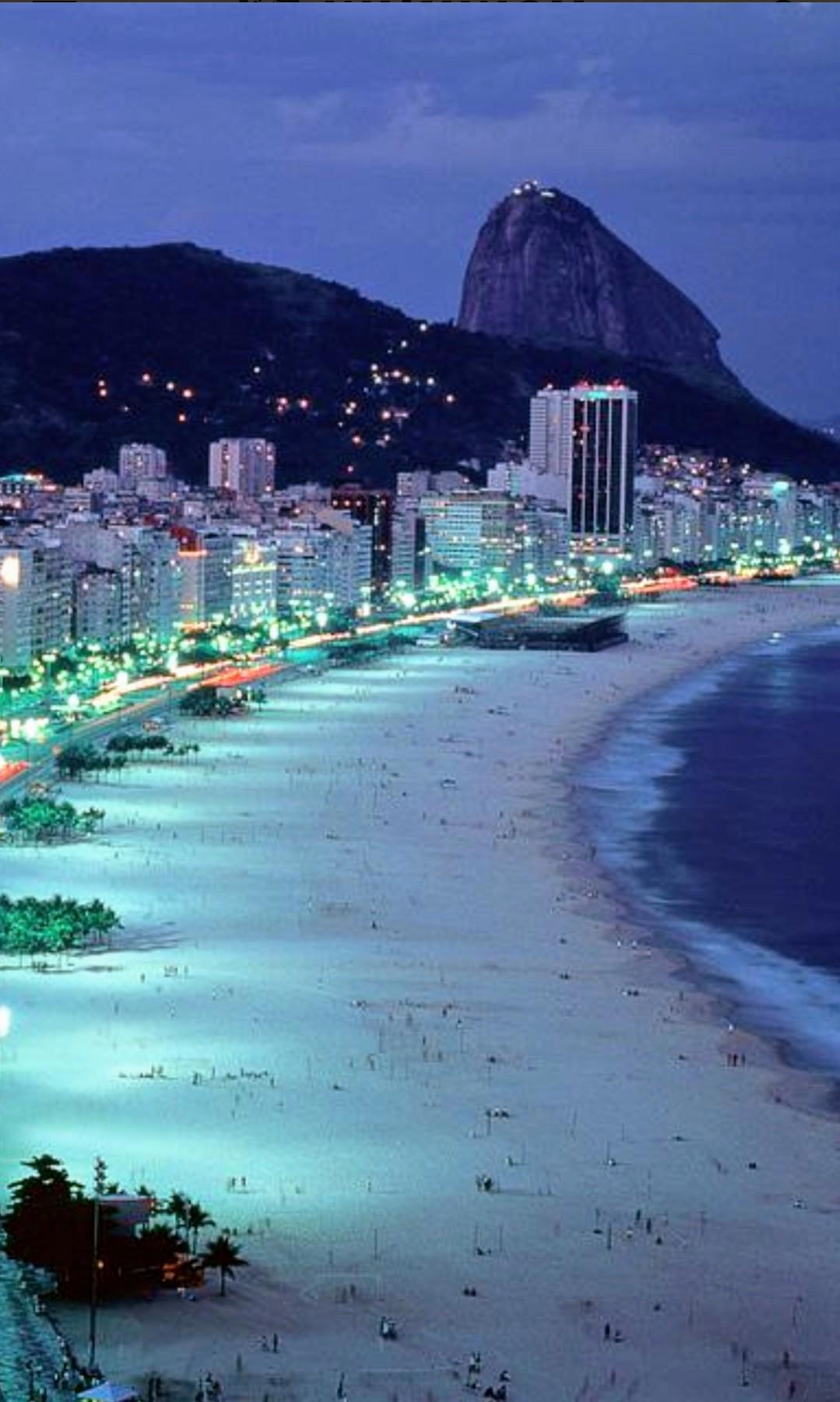 Пляж Копакабана – растянувшая на 4 км полоса белоснежного песка вдоль Атлантического океана у входа в залив Гуанабара, в Рио-де-Жанейро, в Бразилии. Это место в 50-60-х годах было популярно у представителей европейской богемы, а позже стало элитным районом, заселенным бизнесменами, политиками и просто обеспеченными людьми.