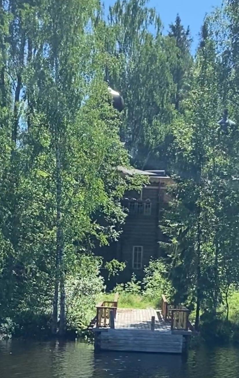 В этом году мы ехать туда не собирались - вместо этого поехали в "туристическую деревню" Мандроги. На самом деле, это никакая не деревня, а элитная база отдыха, лет 15 назад вообще "закрытая". Но потом, в связи с возросшим туристическим движением по Свири в Кижи, тут отгрохали псевдорусскую "деревню" с целью стричь деньги на сувенирах, мастер-классах и рашен водке с транзитных барашков, особенно иностранных. Справедливости ради - сюда были перевезены несколько реальных старинных домов с Вологодской и Архангельской областей (хотя никаким "музеем деревянного зодчества" тут и не пахнет - онли бизнес). И почему-то мы почти не удивились, когда увидели, что вышеозначенная церковь стоит теперь тут - правда, точно так же недостижима для пешего прохода и скрыта деревьями сверху донизу (извините за качество, фотка вырезана из видео). Разобрана на старом месте в 2015 году - дескать, "все равно развалится".