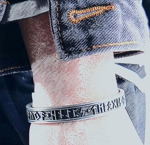 На левом запястье два браслета. Один витой, другой плоский с рунами. На правом — еще один серебряный браслет с двумя волчьими головами, которые тянутся друг к дружке (известная история, два волка Одина — Гери и Фреки).