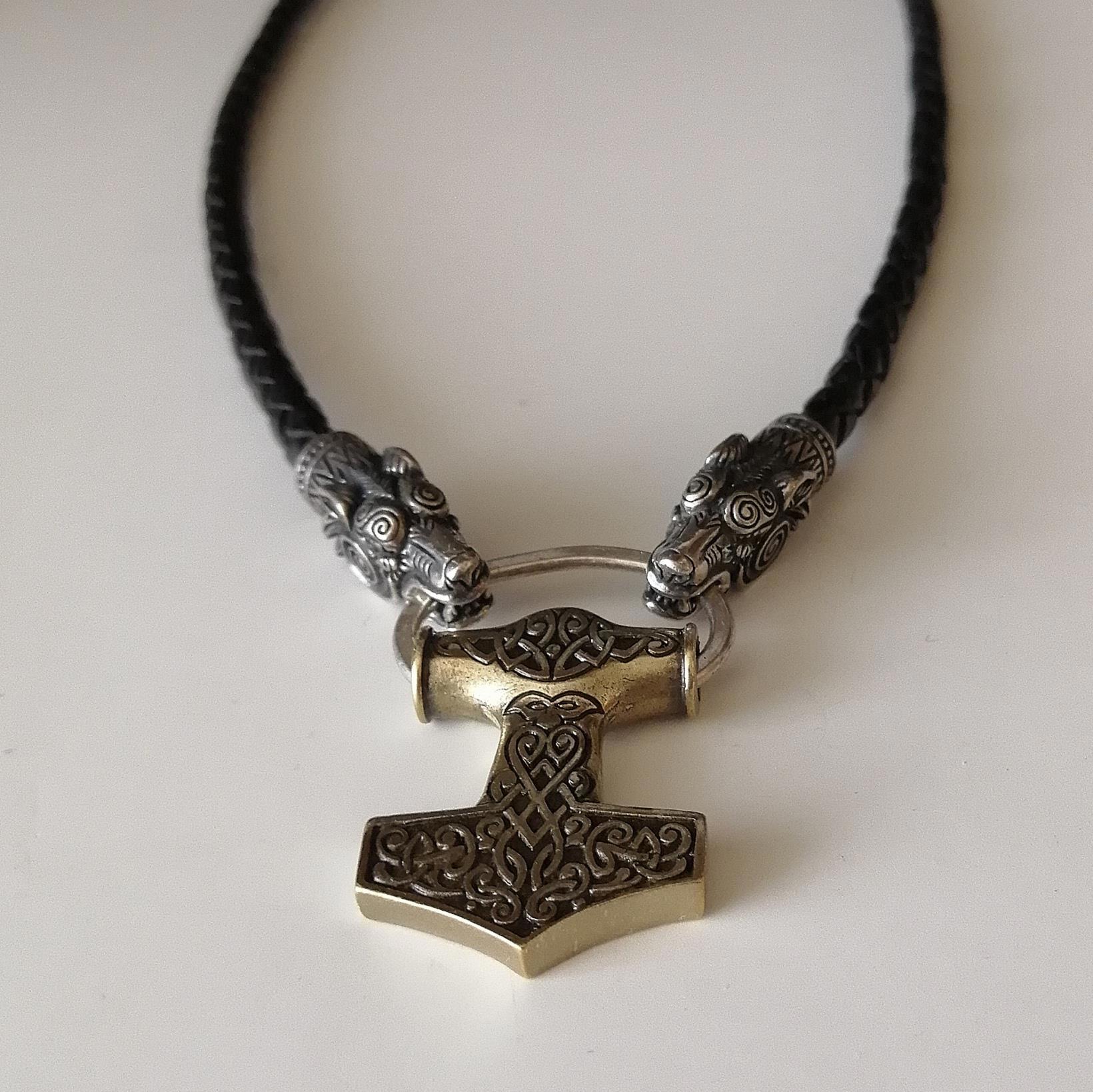 На шее плетёный кожаный шнур, концы которого увенчивают аналогичные серебряные волчьи головы. Но в этом случае им удалось вцепиться зубами в серебряное же кольцо. А на кольце висит молот Тора. Ну да, как же без него. Но это всего лишь побрякушки. Не самое важное. Хотя полностью соответствует образу.