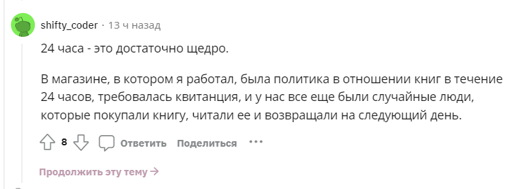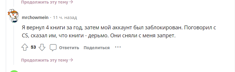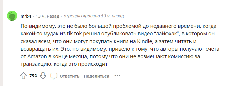В сети полно лайфаков, как взять почитать книгу на “Амазон”, а потом вернуть деньги. Обманывая писателей. Одна из читательниц подала петицию, понимая, что люди просто перестанут писать в таких условиях, и она может не дождаться продолжения любимых книг. Петиция набрала уже 70 000 подписей. Люди голосуют за то, чтобы “Амазон” изменил свою политику по возврату книг.