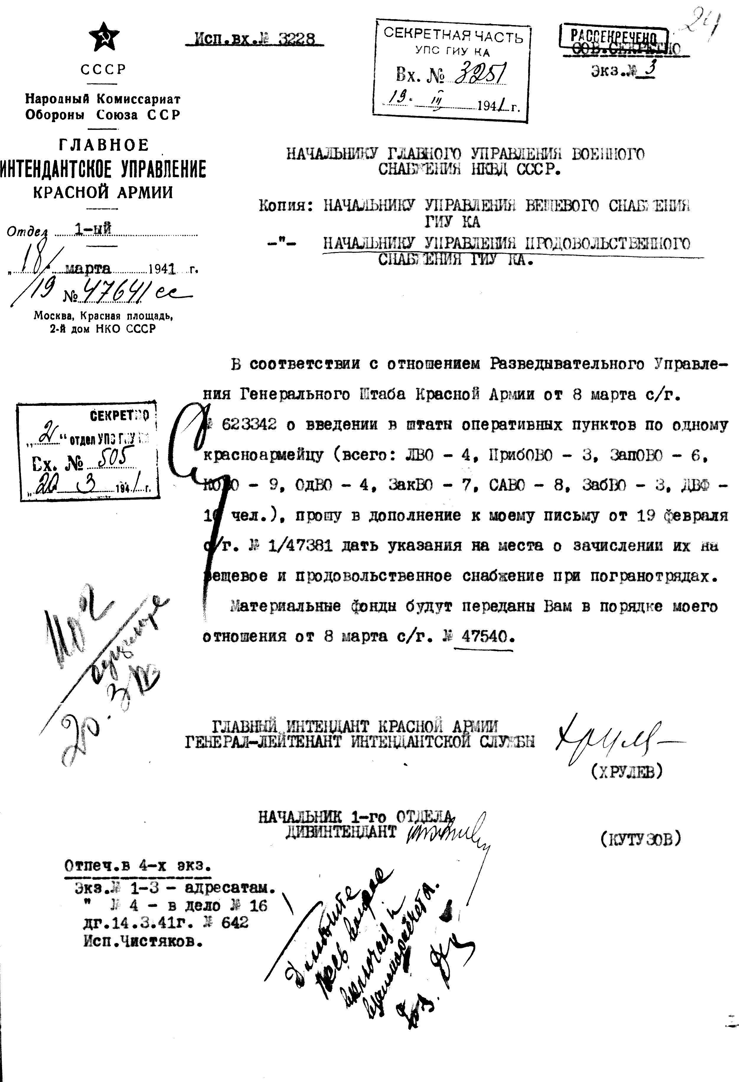 д/с: Указание Главного Интенданта КА по организации снабжения оперативных пунктов Разведотделов приграничных военных округов![]()