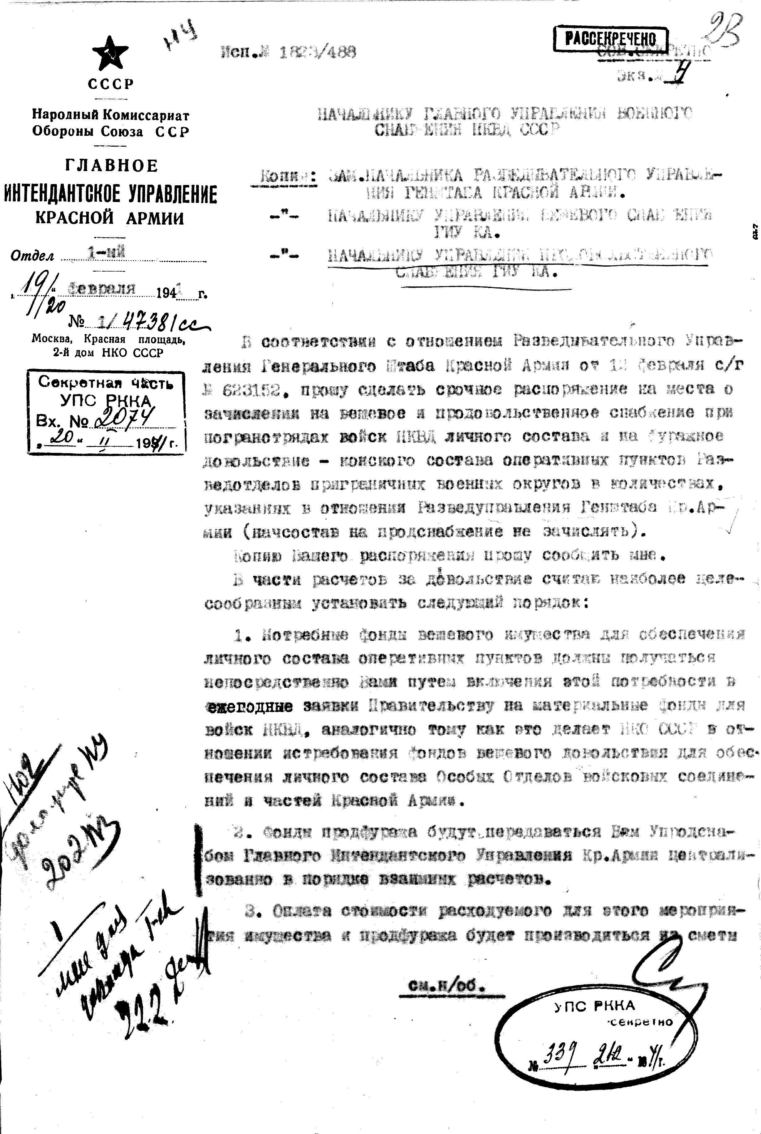 Нисколько не сомневаясь в правоте собеседников, попытался найти хоть какие-то упоминания о разведывательных подразделениях Разведупра ГШ Красной Армии в интендантских документах. Надо же и разведчикам чем-то питаться, да и обмундирование с гражданской одеждой где-то получать.