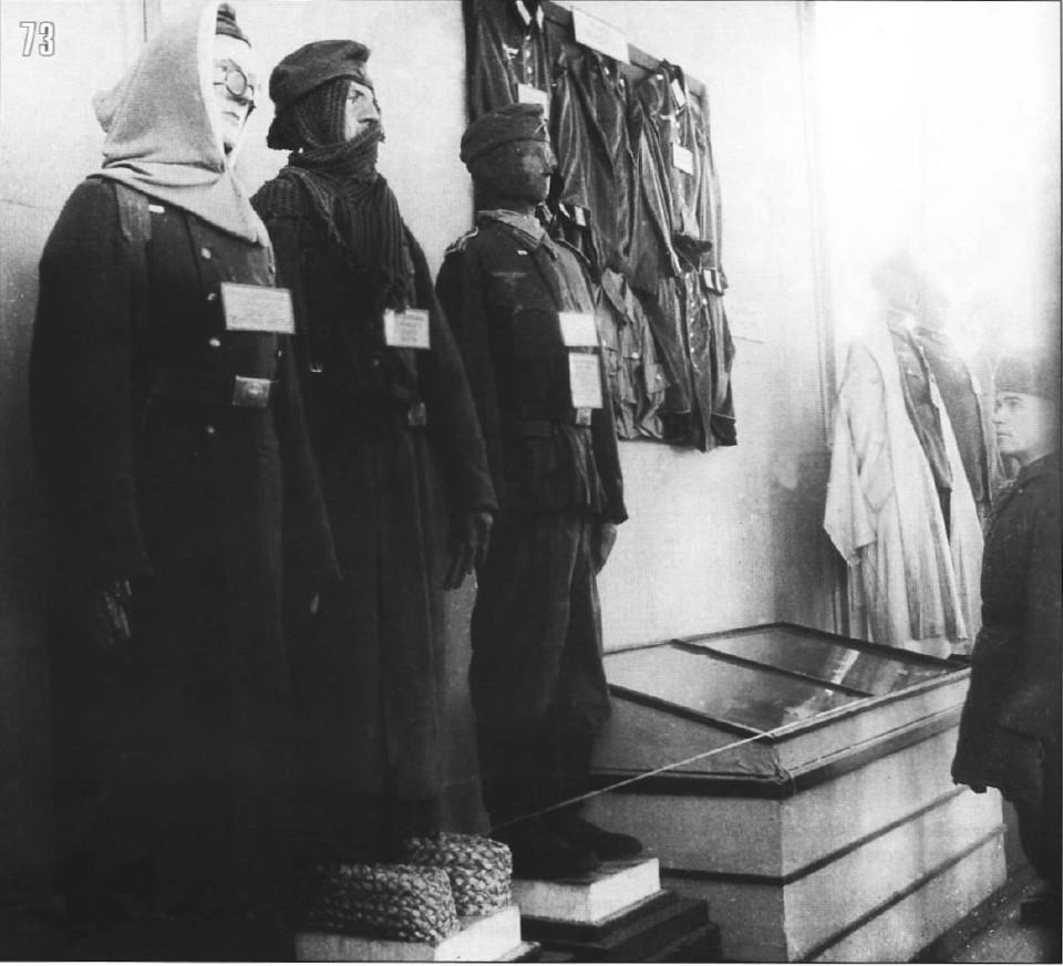 73. В экспозиции интендантского отдела выставки трофейного вооружения ЦПКиО было представлено огромное количество образцов формы одежды немецкой армии и её союзников. При этом часть экспонатов была одеты на манекены, а часть на различных стендах и в витринах. Все экспонаты были снабжены подробными аннотациями.
