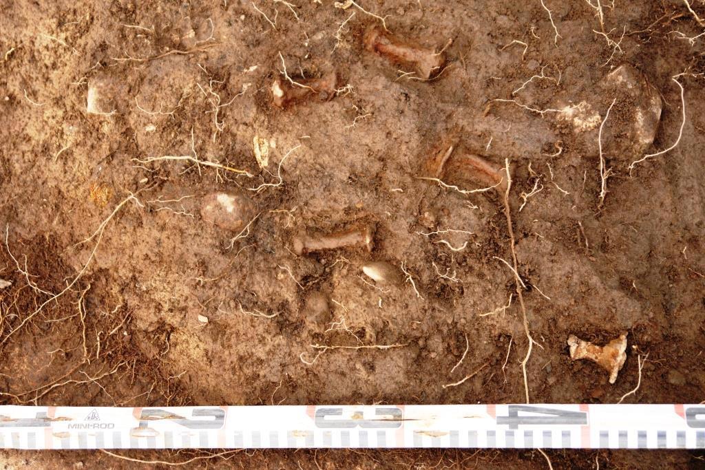 В результате раскопок широкой площадью было открыто погребение, совершенное по обряду кремации на стороне. По всей вероятности, оно было помещено в углубление у края скалы. Над погребением было поставлено килем вверх небольшое судно, приблизительно 7-8 м в длину (на это указывает распределение заклепок в плане). Глубина залегания была минимальной, не более 20 см, и поэтому деревянные части ладьи не сохранились. Но были найдены несколько десятков ладейных заклепок разных типов. Можно предположить, что это был целый объект, и элементы обшивки скреплялись разными по форме железными деталями. Кроме того, на заклепках нет следов воздействия огня, это значит, что погребенный не был кремирован вместе с ладьей.
