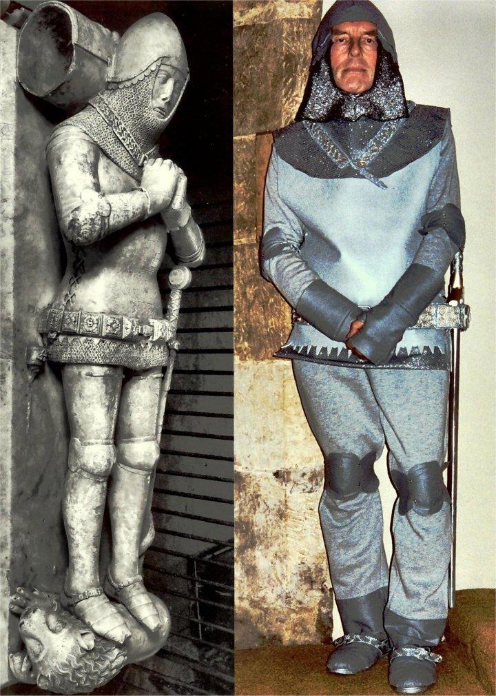 На надгробном изваянии сэра Джона Суинфорда из Спрэттона, которое находится в церкви св. Эндрю, можно рассмотреть такое украшение. И относится оно к XIV веку.