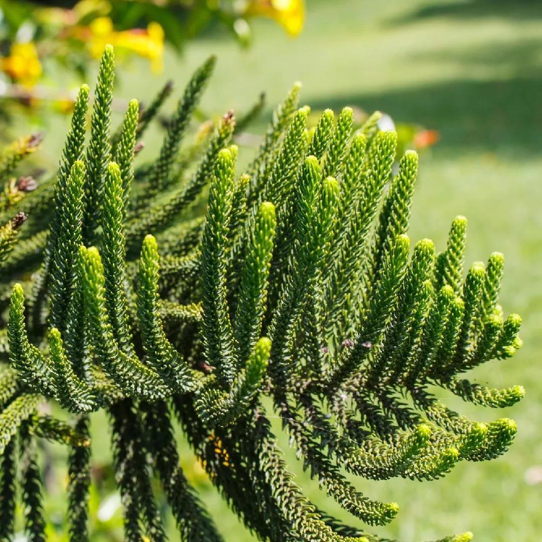 Это хвойное очень необычно. Вместо иголочек — мягкие, крохотные росточки с чешуйками. Я не хочу сейчас использовать специальную терминологию. Достаточно просто увидеть, что веточка араукарии сильно отличается от привычных нам хвойных пород.