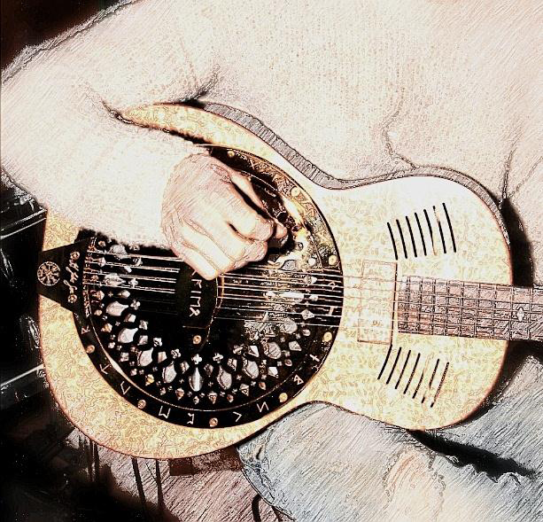 — Да, это акустическая резонаторная гитара. Их изобрели в США в конце 20-х годов двадцатого века. Тогда, во время расцвета джаза, электрогитар ещѐ не знали, а заставить гитару звучать громче хотелось. Вот и догадались встроить в корпус обычной акустической гитары металлические резонаторы. Кстати, у этого инструмента и звук