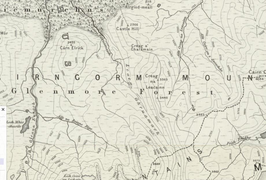 Дорога Лайриг-Гру обозначена нежирным пунктиром, идущим примерно с севера на примерно юг. Горка Срон-на-Лайриг здесь не подписана, это тот пятак в самом низу по центру, где написана высота 3839 футов (1170 м)