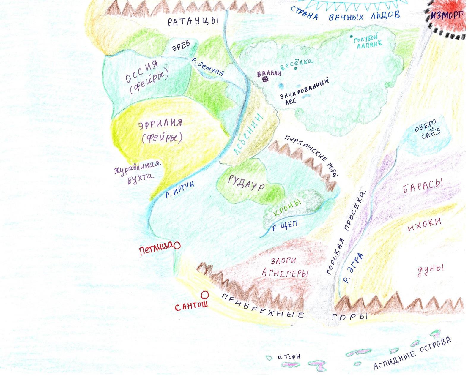 Карта приблизительная. Во-первых, это не весь материк, а только та часть, где бывали мои герои. Во-вторых, Страна Вечных Льдов и Изморг не должны быть так близко друг к другу. Они, на самом деле, за пределами этой карты, но мне хотелось уместить всё на одном листе, а опыта рисования карт у меня нет. В-третьих, в Кроре больше городов, поселений и народов, но не все они упоминаются в романе и не все присутствуют на карте.