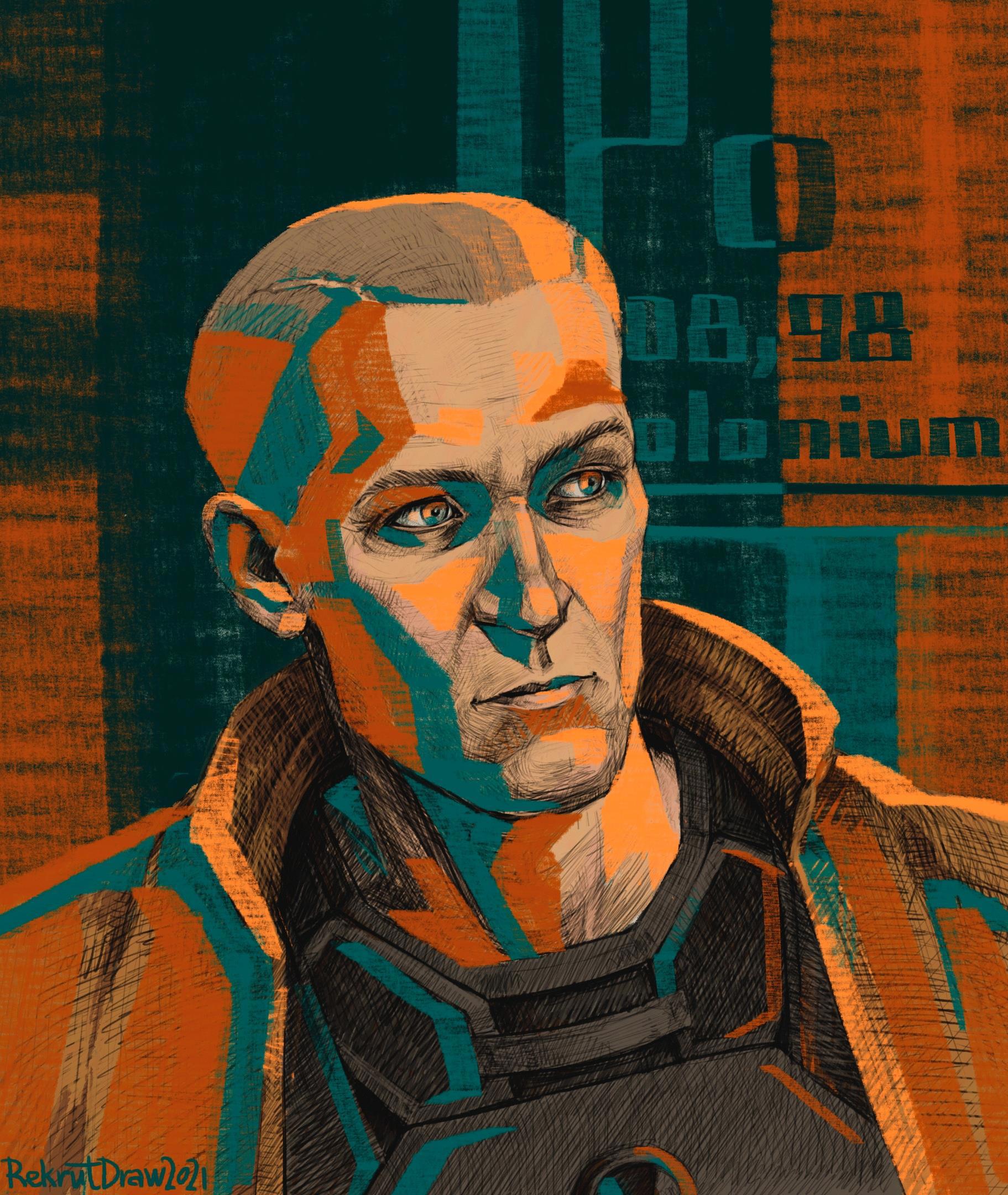 Чтож, история не самая захватывающая. Но присмотритесь к результату! Вы чувствуете эту атмосферу? Вы видите эту текстуру? Эти руки? Этот взгляд? Цифру 4? Эмблему экспедиции? Маленький оранжевый квадратик на шее? Всё не просто близко к тексту. Я, автор, теперь вижу этого персонажа именно так. Вот ссылка на повесть, можете проверить!