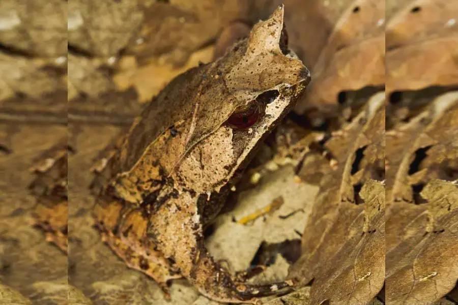 Эта крупная бесхвостая амфибия умело маскируется под веточки или ряску, но лучше всего ей удаётся спрятаться на пожухлой листве. Маленькие бугорки на спине лягушки успешно имитируют листовые наросты. Чтобы так виртуозно «растворяться» на фоне старых листьев, нужно просто родиться рогатой чесночницей.