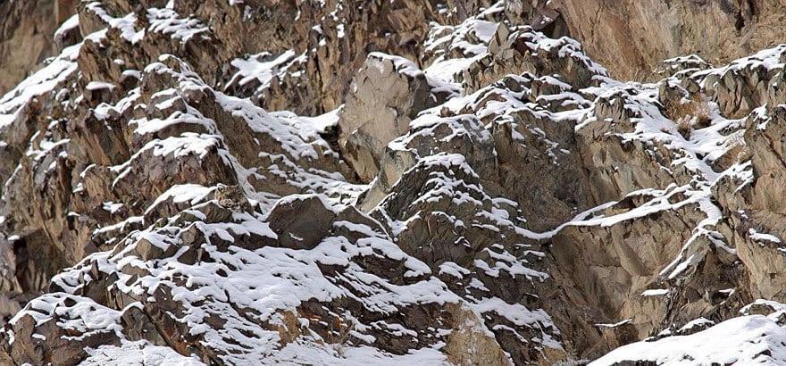 На первый взгляд, на фотографии показан лишь каменистый склон горы, покрытый снегом. Но где-то там скрывается снежный барс.