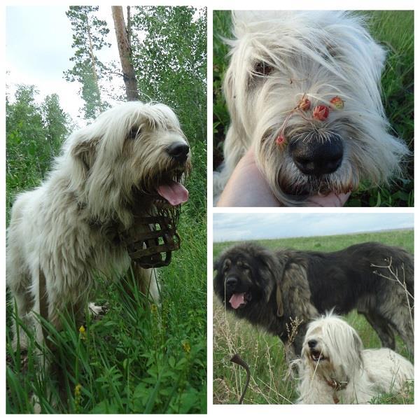 С Муркой "кавказская овчарка, кобель" - он ни за кем не следит, он увалень. Но, он сам находит земляничную полянку и обозначает её тем, что ложиться на бок посередине полянки, я вокруг него полза